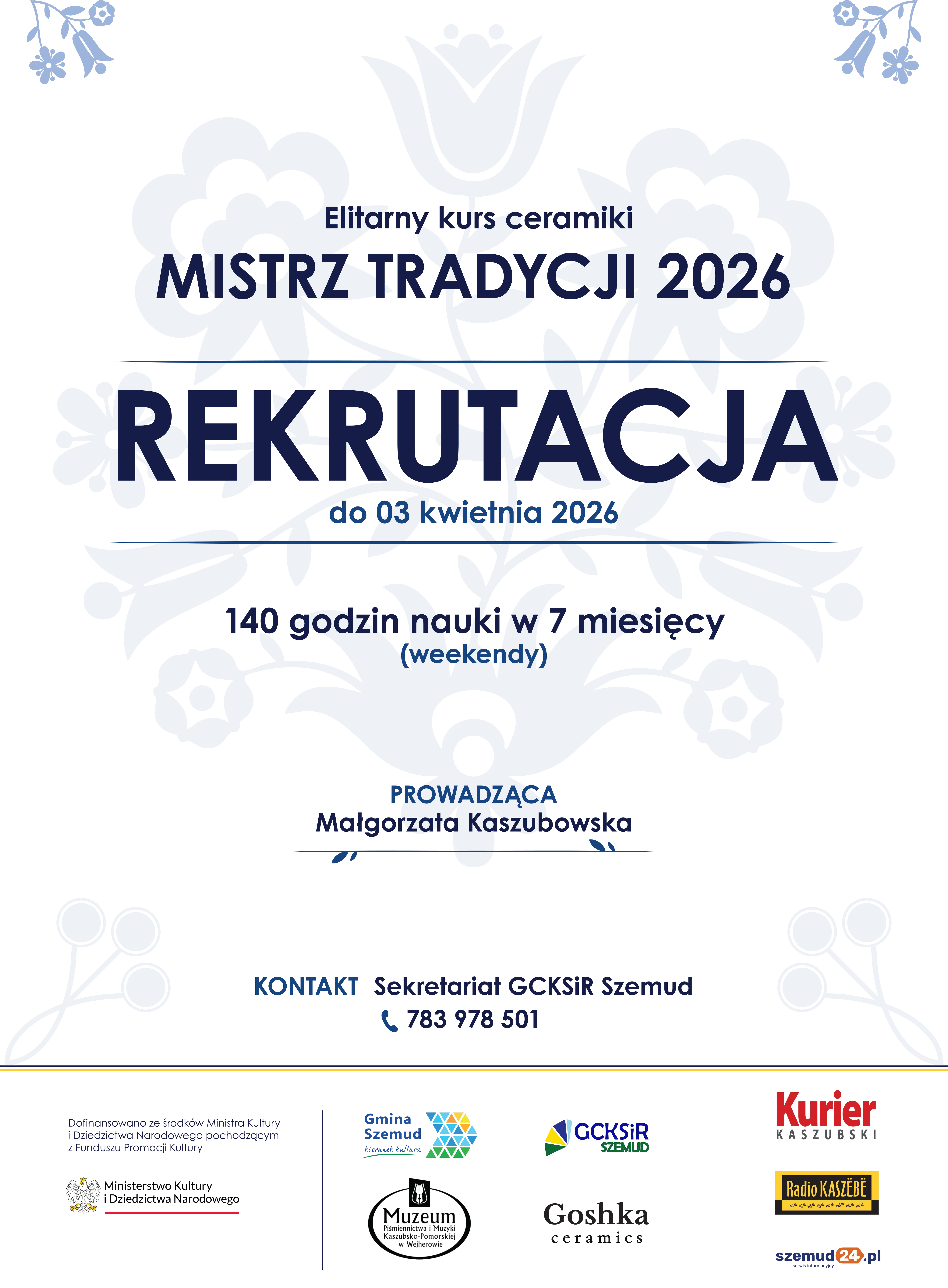Gminne Centrum Kultury, Sportu i Rekreacji w Szemudzie zakwalifikowało się do prestiżowego programu „Mistrz Tradycji” 2026, finansowanego ze środków Ministerstwa Kultury i Dziedzictwa Narodowego. To niepowtarzalna szansa dla osób, które chcą ocalić od zapomnienia ginące rzemiosło i w przyszłości same stać się ambasadorami kaszubskiej sztuki.