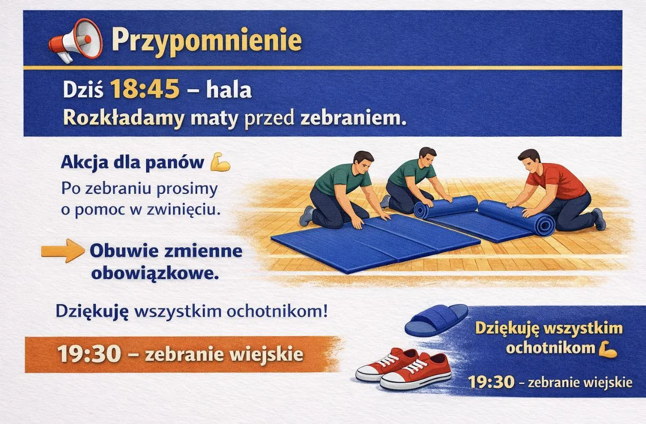Zbiórka wszystkich chętnych pomocników odbędzie się o godzinie 18:45 bezpośrednio na hali. "To akcja skierowana do panów, którzy mają siłę i możliwość pomóc przy przenoszeniu oraz rozkładaniu ciężkich mat. Po zebraniu prosimy o pozostanie kilka minut i pomoc w ich zwinięciu — robimy to, aby nie zniszczyć parkietu naszej hali. "