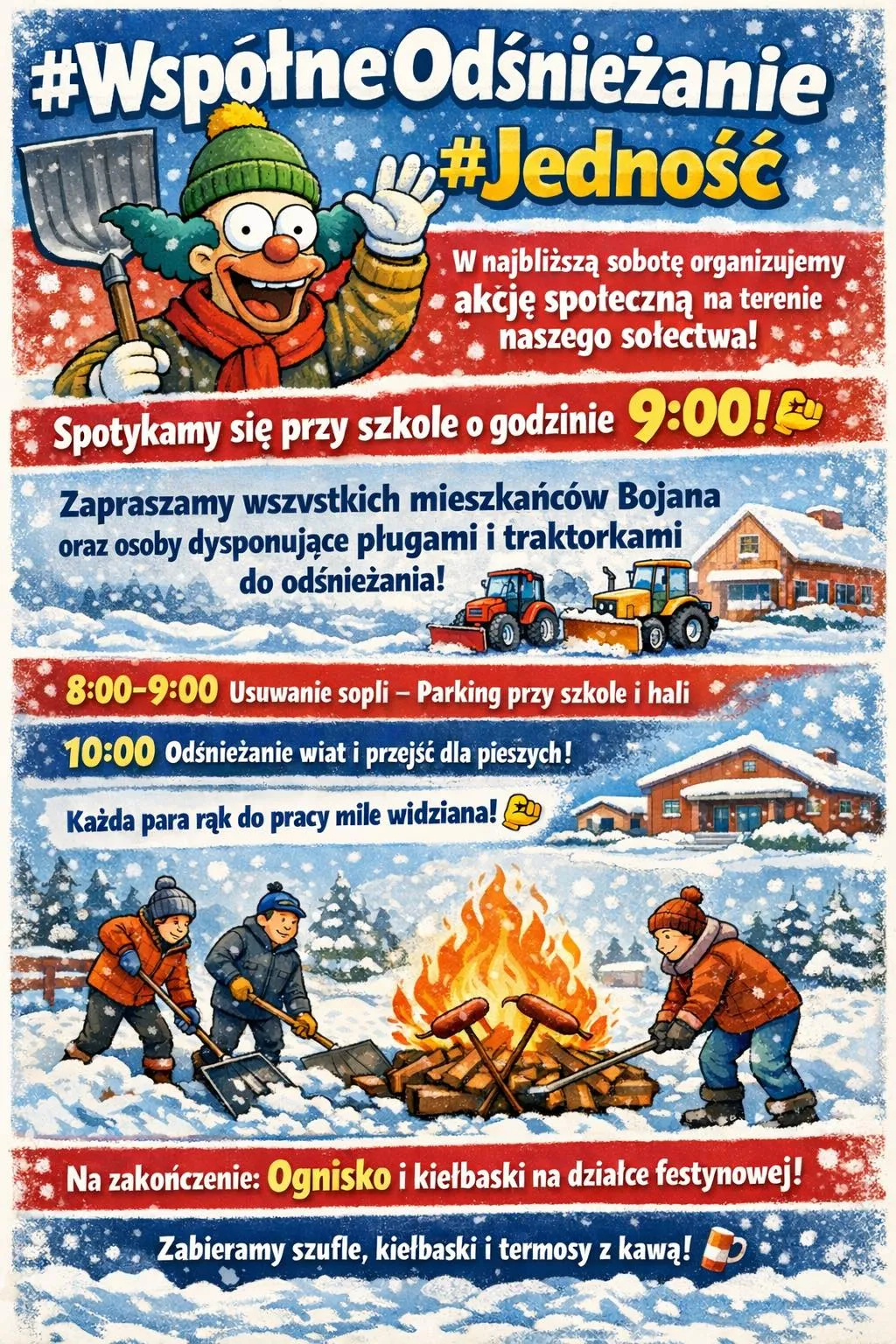 Mieszkańcy sołectwa Bojano po raz kolejny udowadniają, że hasło #Jedność to dla nich nie tylko internetowy hashtag, ale realne działanie. Już jutro, 21 lutego, odbędzie się społeczne odśnieżanie, które ma na celu poprawę bezpieczeństwa i komfortu życia w miejscowości. Organizatorzy zadbali o każdy szczegół – od oficjalnych pozwoleń po bezpieczeństwo wolontariuszy.