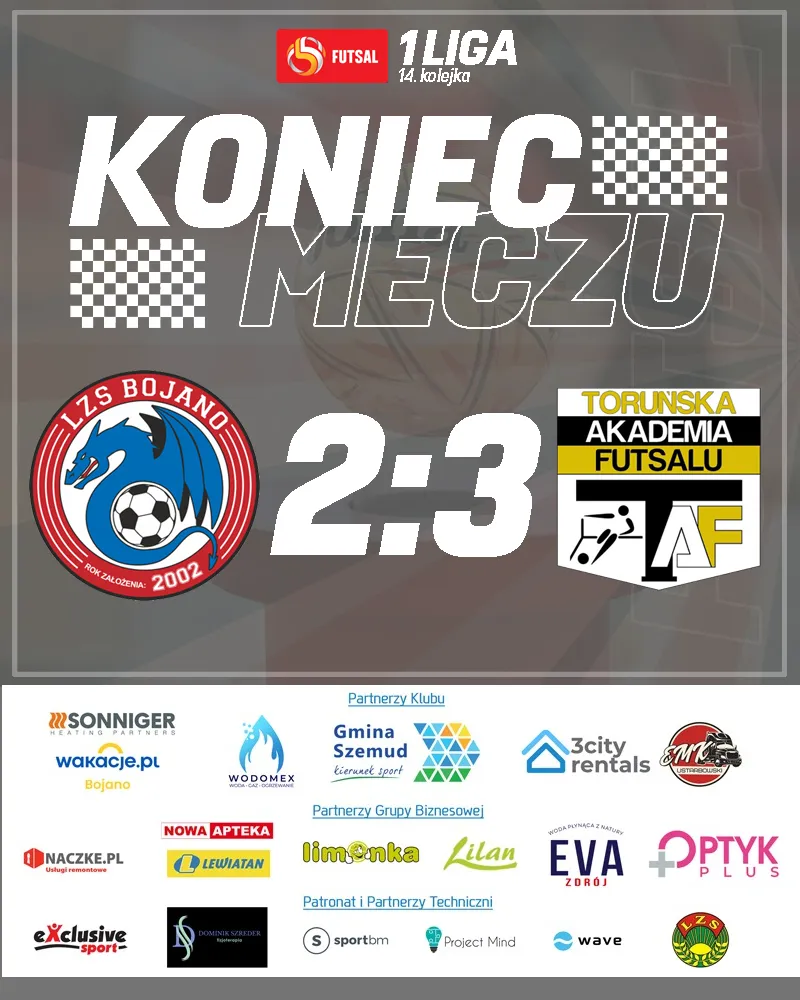 W minioną niedzielę, 8 lutego w ramach 14. kolejki 1. Polskiej Ligi Futsalu, LZS Dragon Bojano zmierzył się z wymagającą ekipą TAF Toruń na Hali Widowiskowo-Sportowej w Przodkowie. Choć widowisko stało na wysokim poziomie, o końcowym wyniku zdecydował brak sportowego szczęścia gospodarzy.