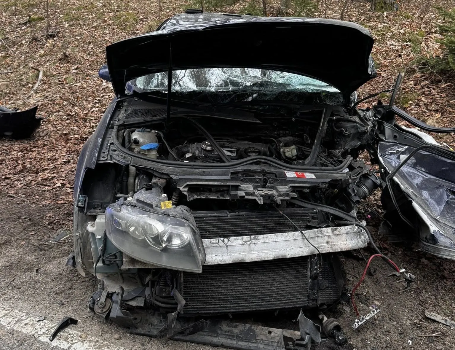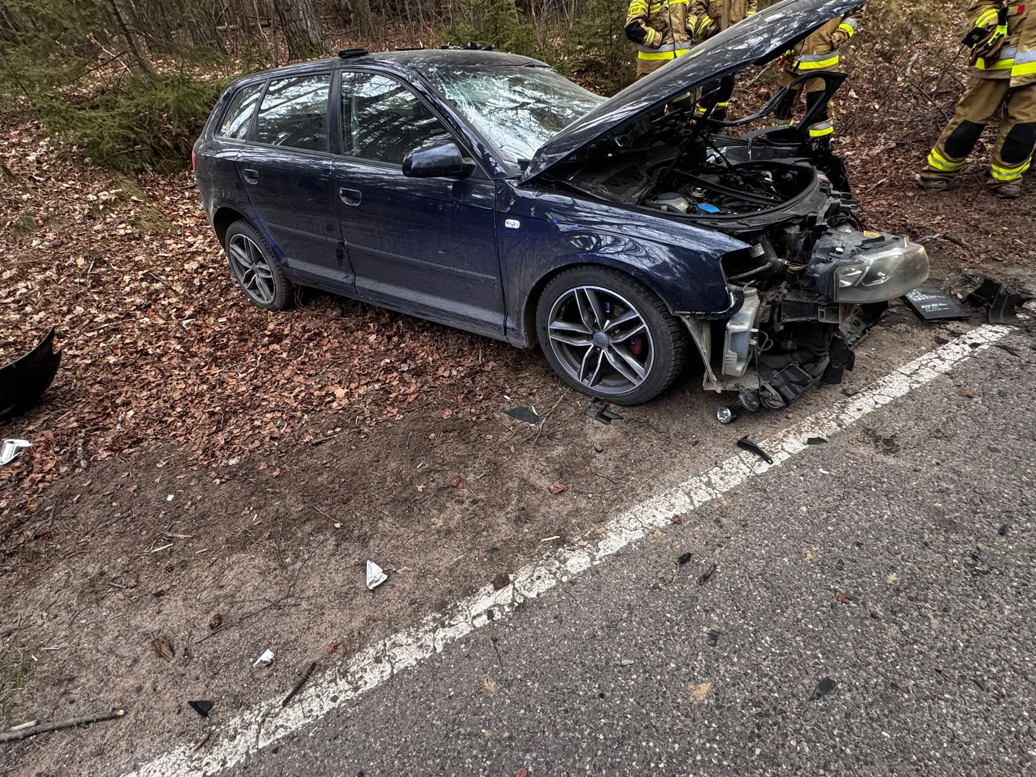 Siła uderzenia była na tyle duża, że kierowca Audi został uwięziony w kompletnie rozbitym pojeździe. Strażacy, przy użyciu specjalistycznego sprzętu, musieli rozcinać karoserię, aby wydobyć poszkodowanego. Mężczyzna w stanie nieprzytomnym został bezzwłocznie przetransportowany przez Zespół Ratownictwa Medycznego do szpitala.