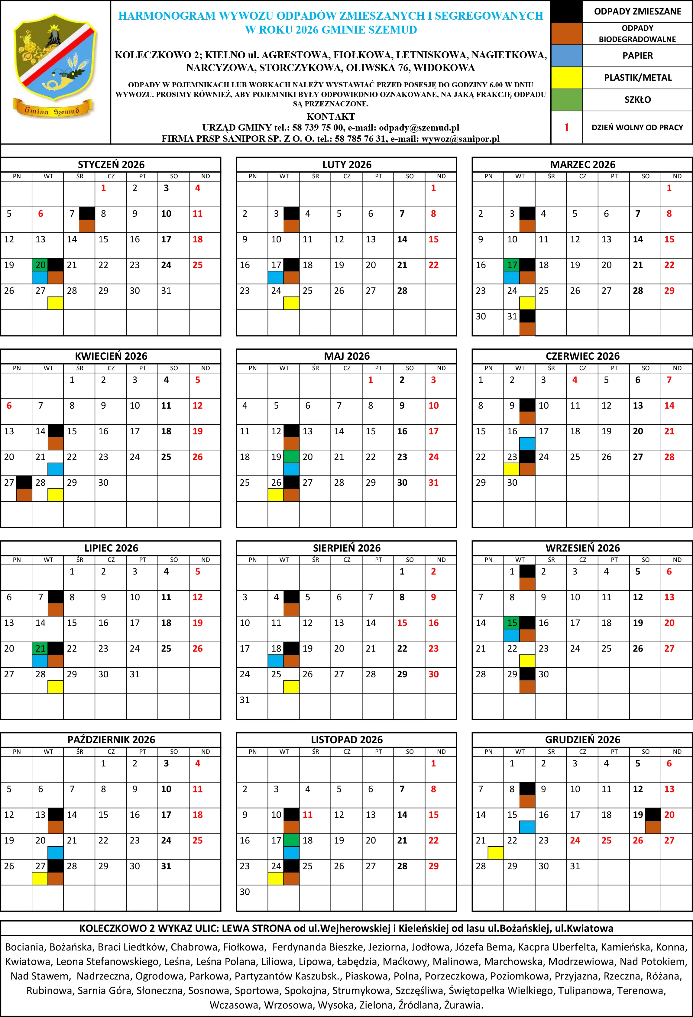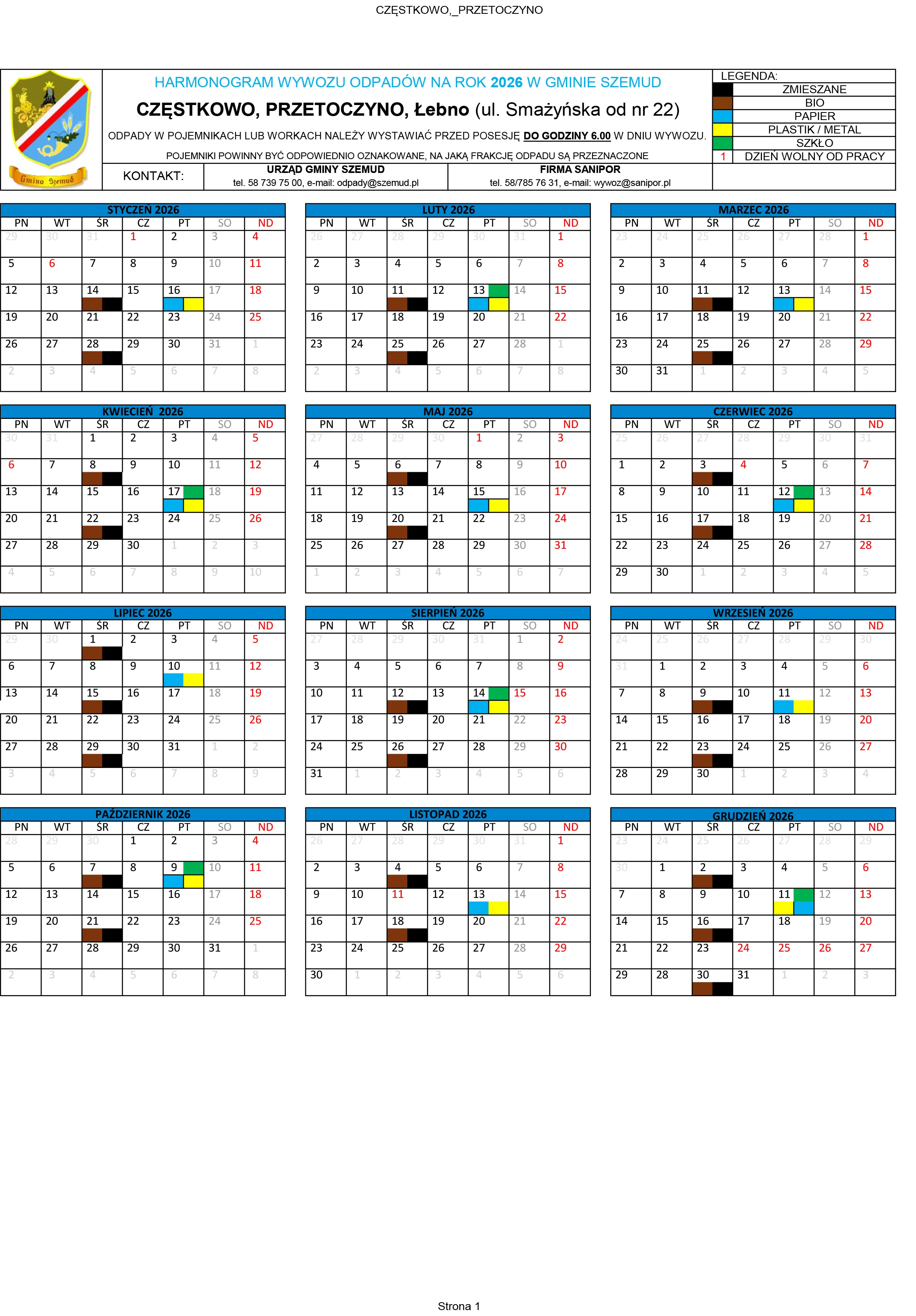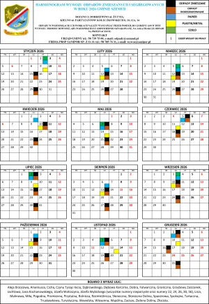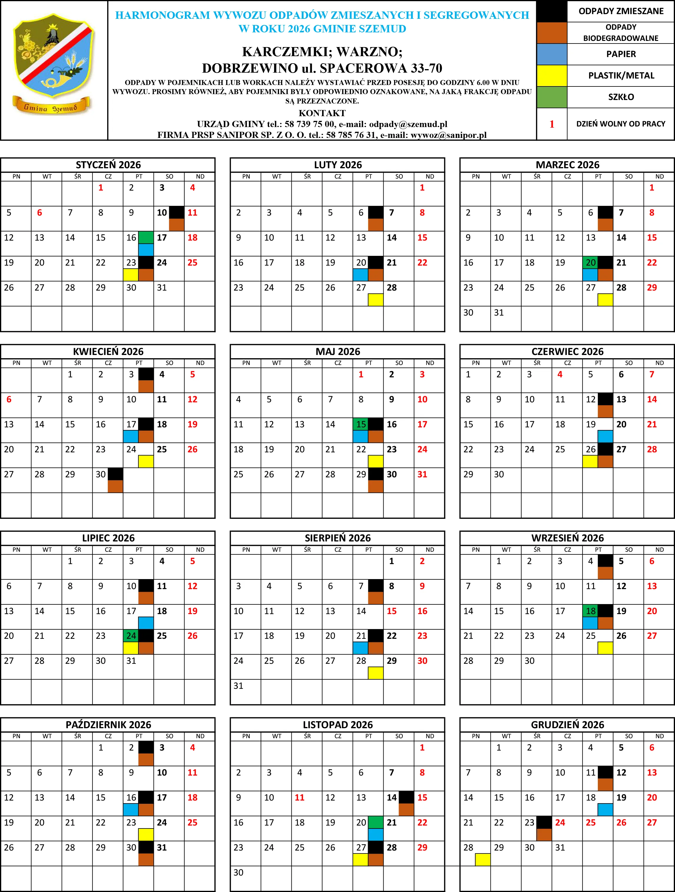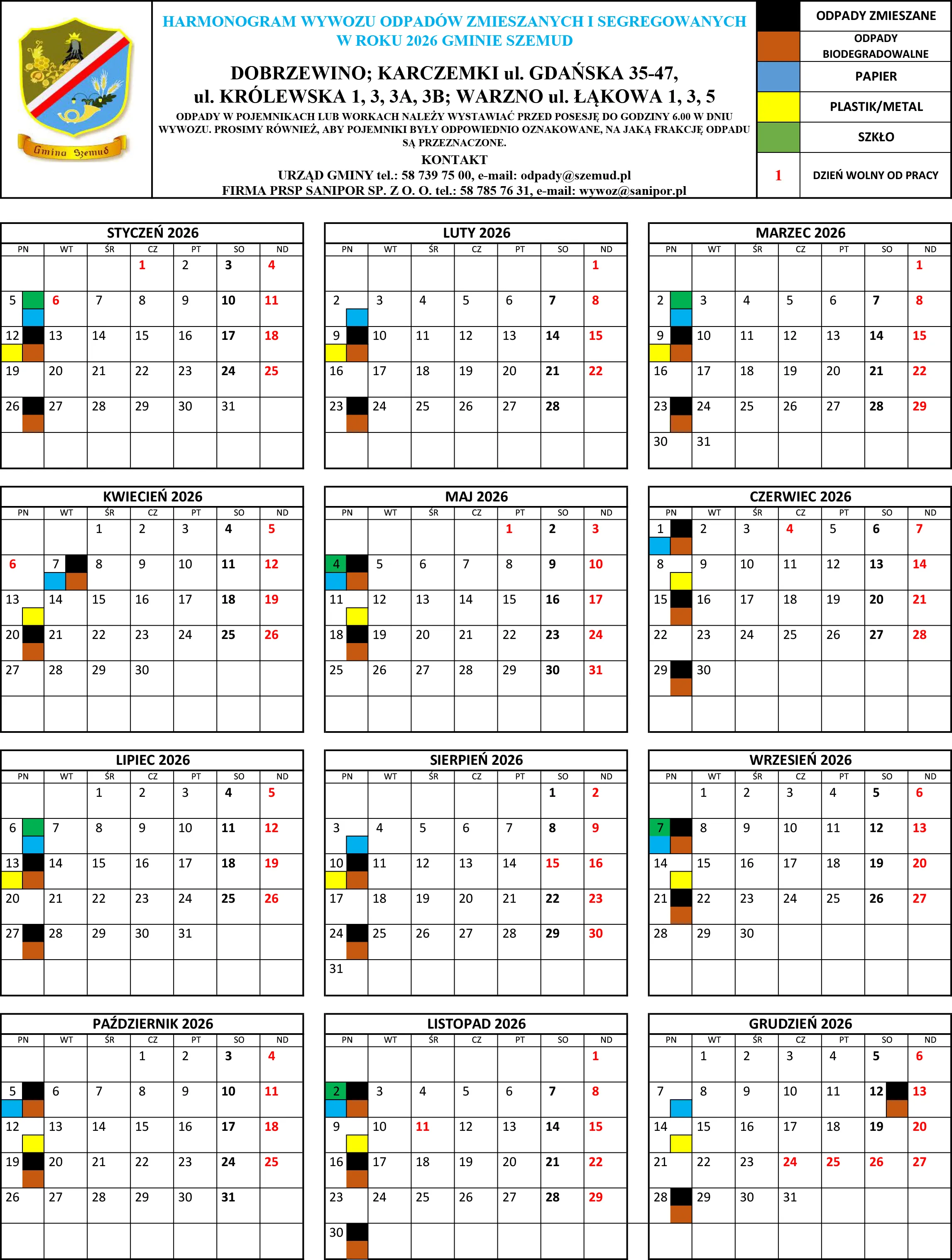Poniżej terminy odbioru odpadów komunalnych na terenie Gminy Szemud. Zachęcamy mieszkańców do zapoznania się ze szczegółowym harmonogramem wywozu śmieci, który będzie obowiązywał w 2026 roku.