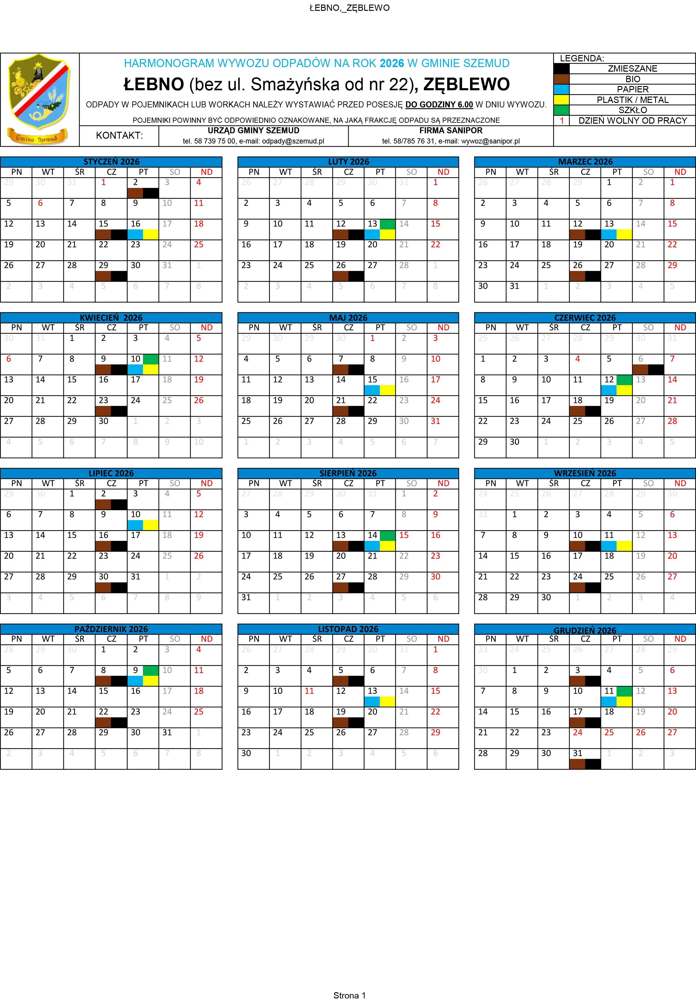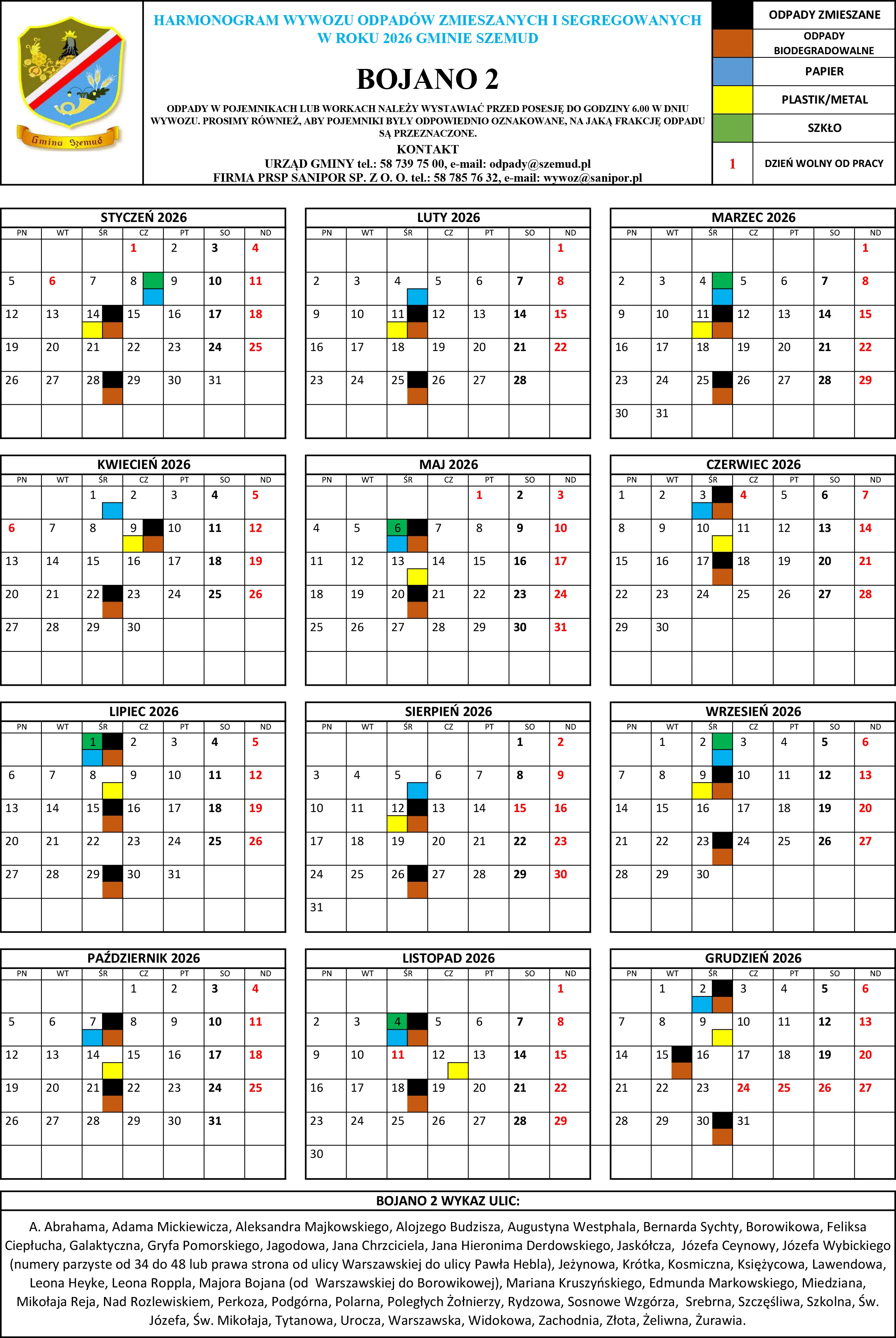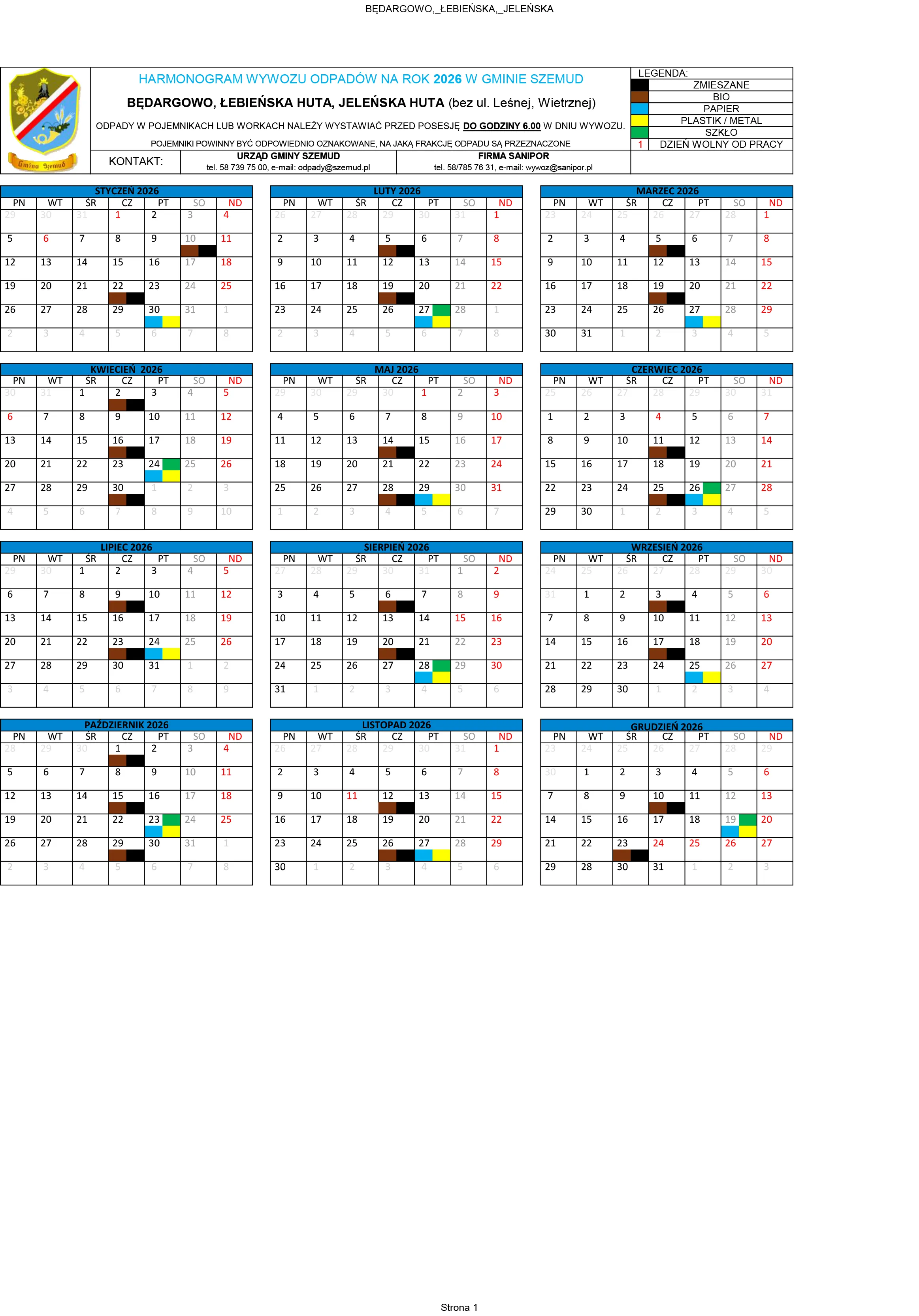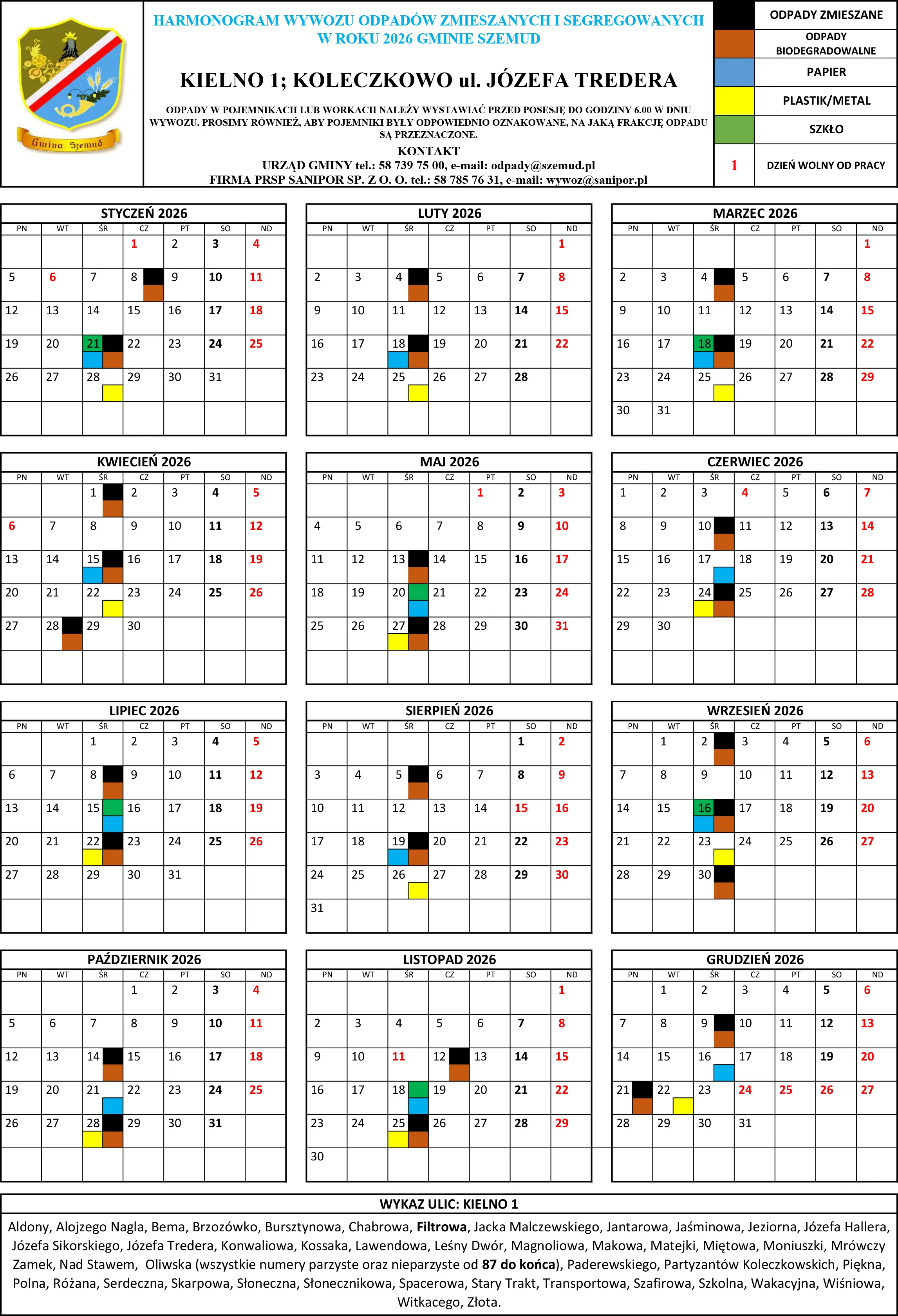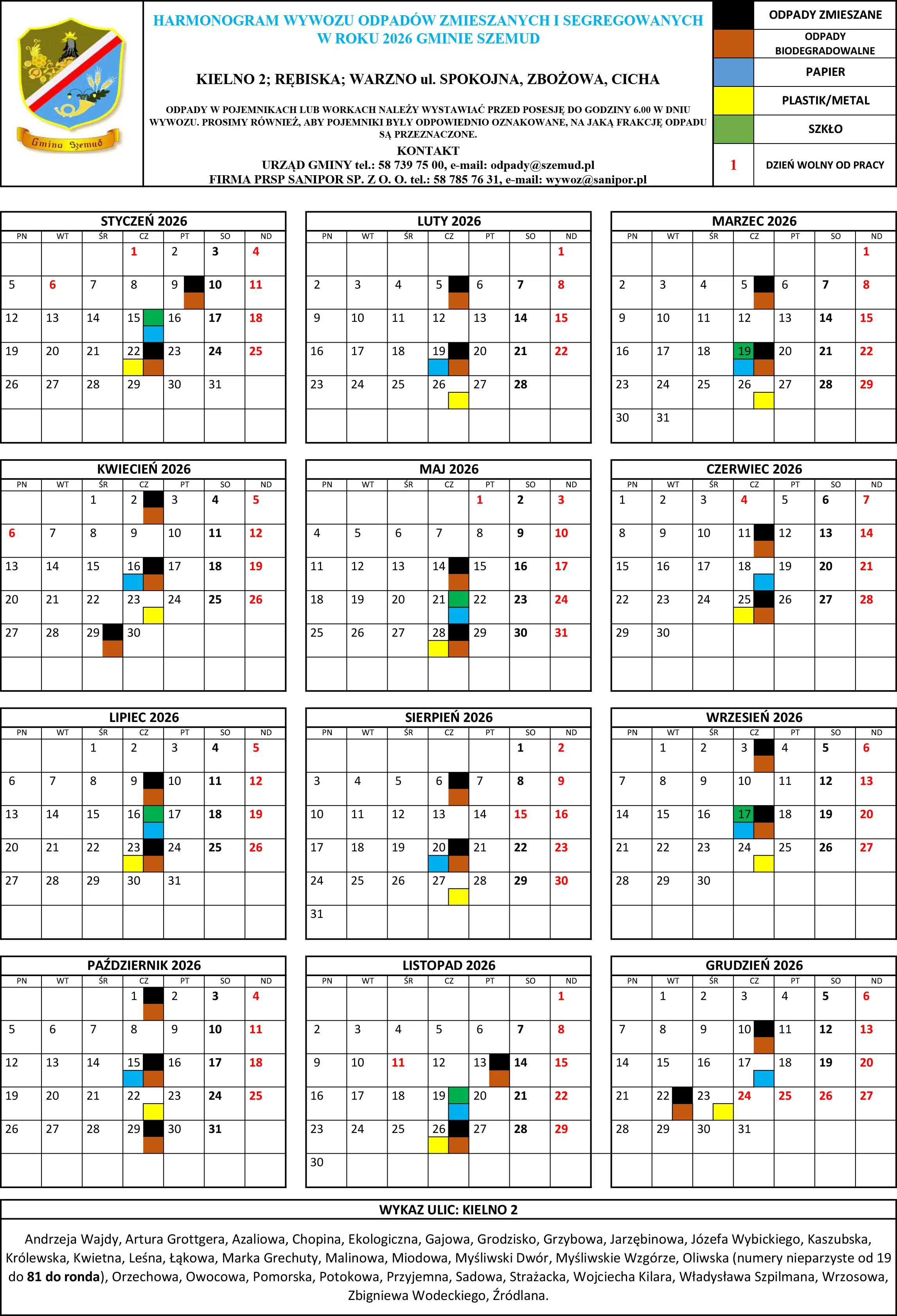 Poniżej terminy odbioru odpadów komunalnych na terenie Gminy Szemud. Zachęcamy mieszkańców do zapoznania się ze szczegółowym harmonogramem wywozu śmieci, który będzie obowiązywał w 2026 roku.