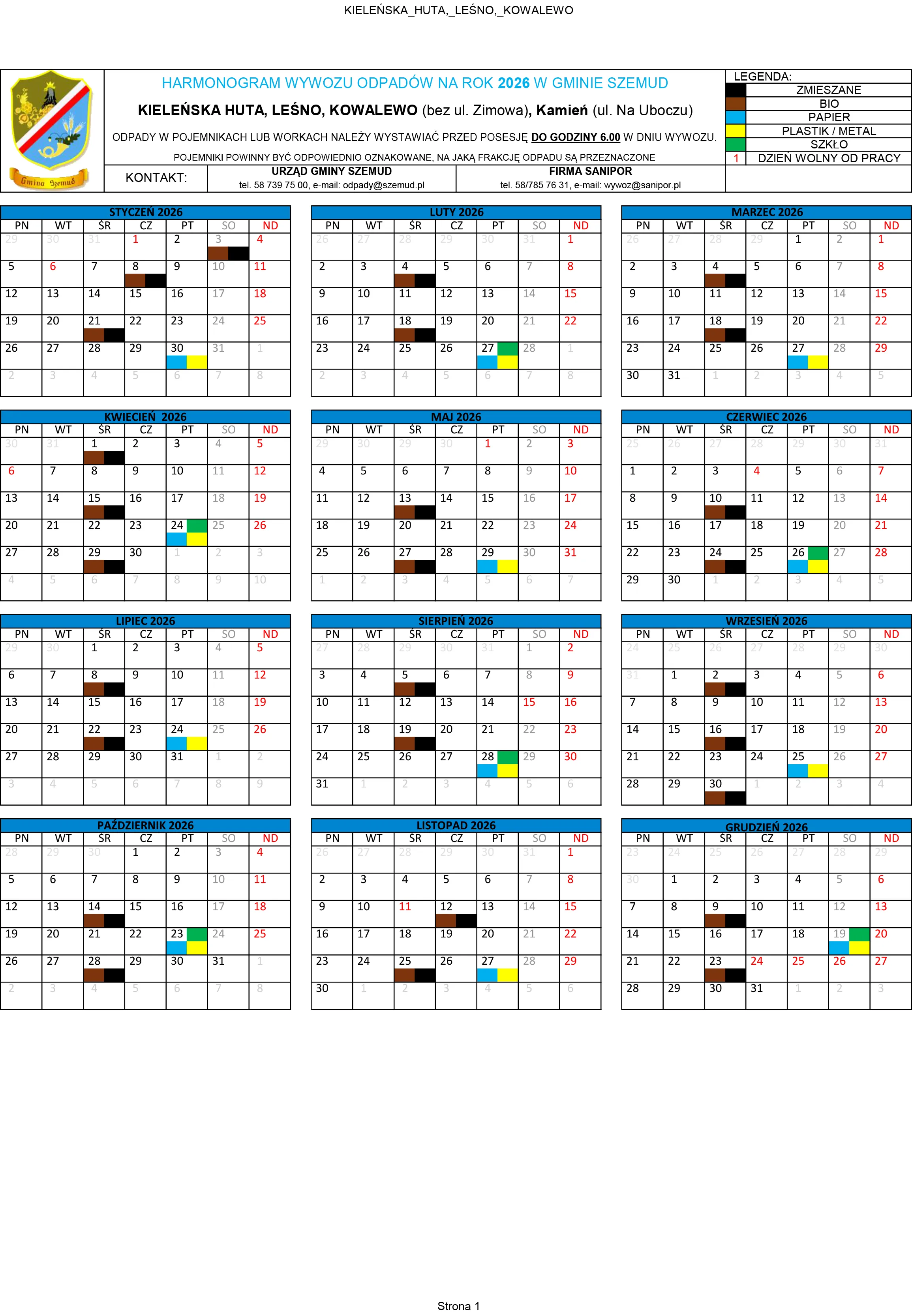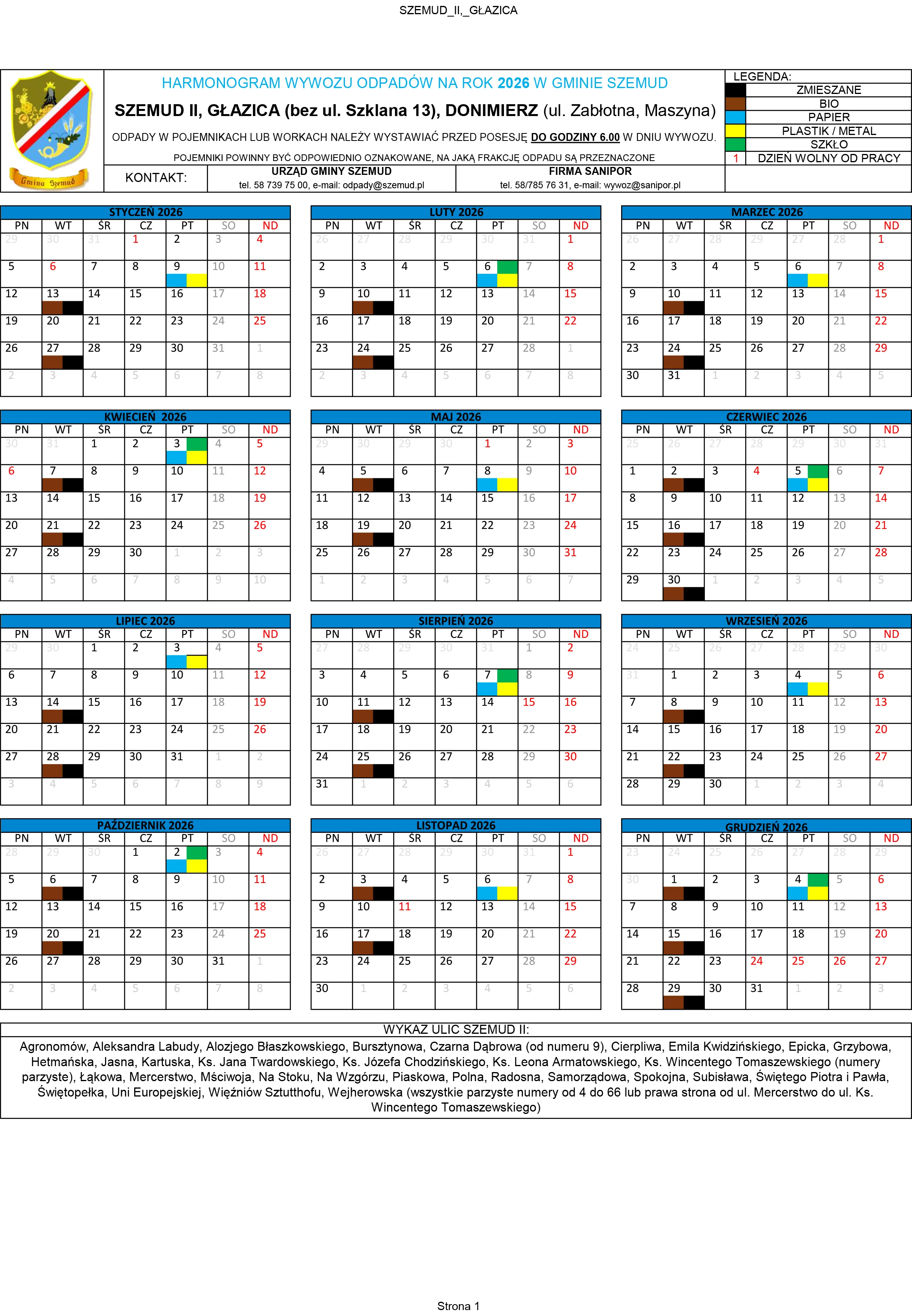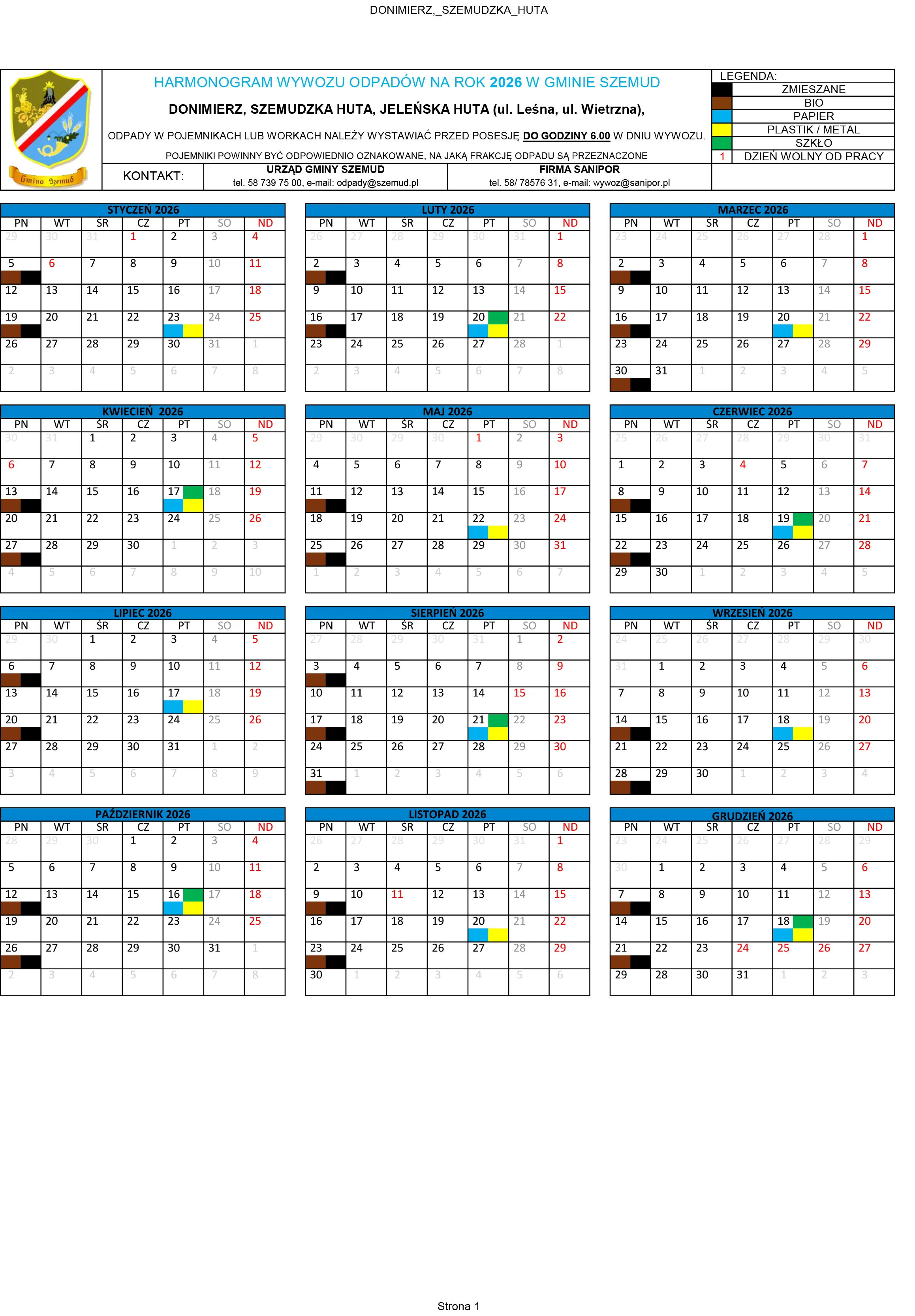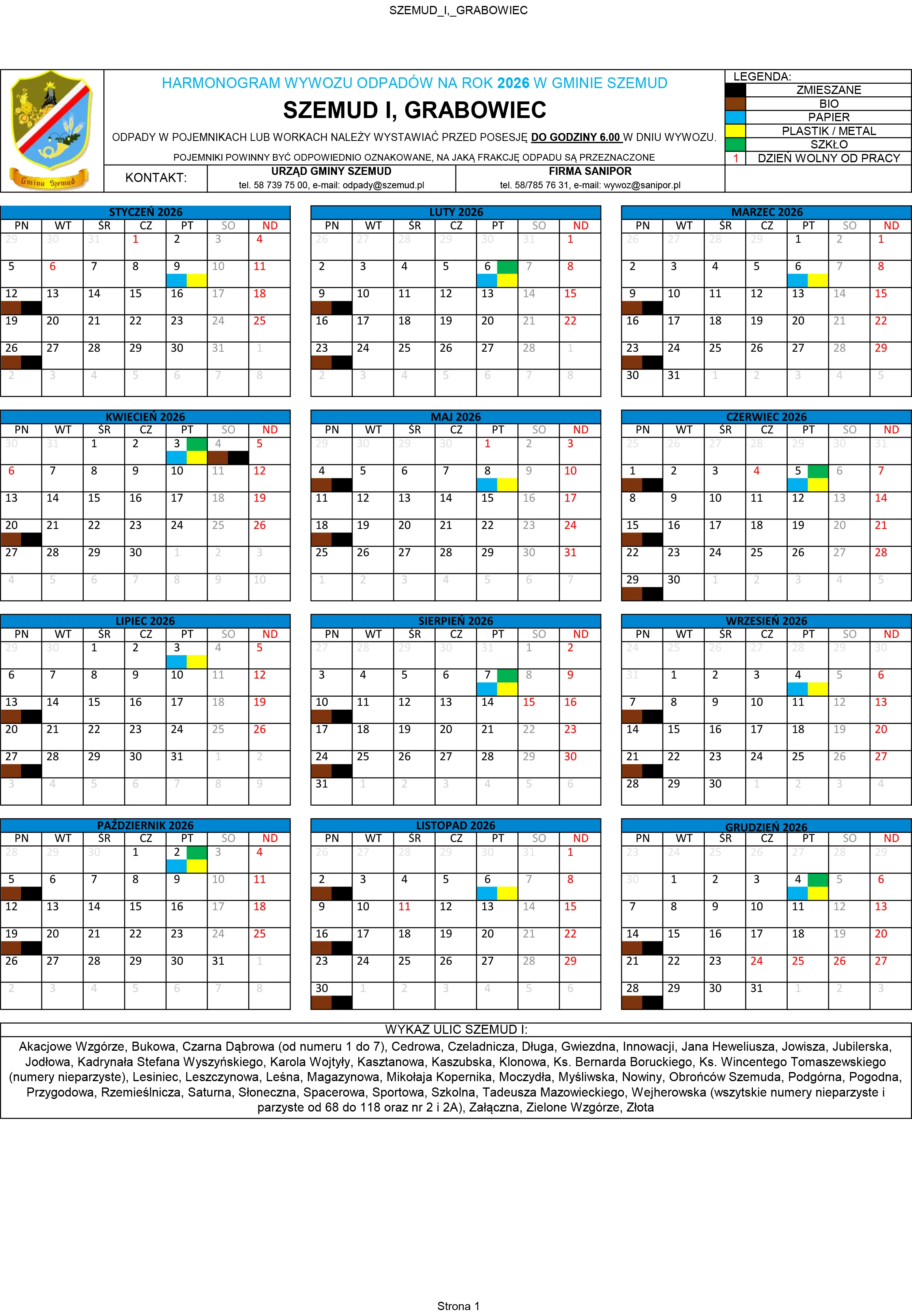 Poniżej terminy odbioru odpadów komunalnych na terenie Gminy Szemud. Zachęcamy mieszkańców do zapoznania się ze szczegółowym harmonogramem wywozu śmieci, który będzie obowiązywał w 2026 roku.