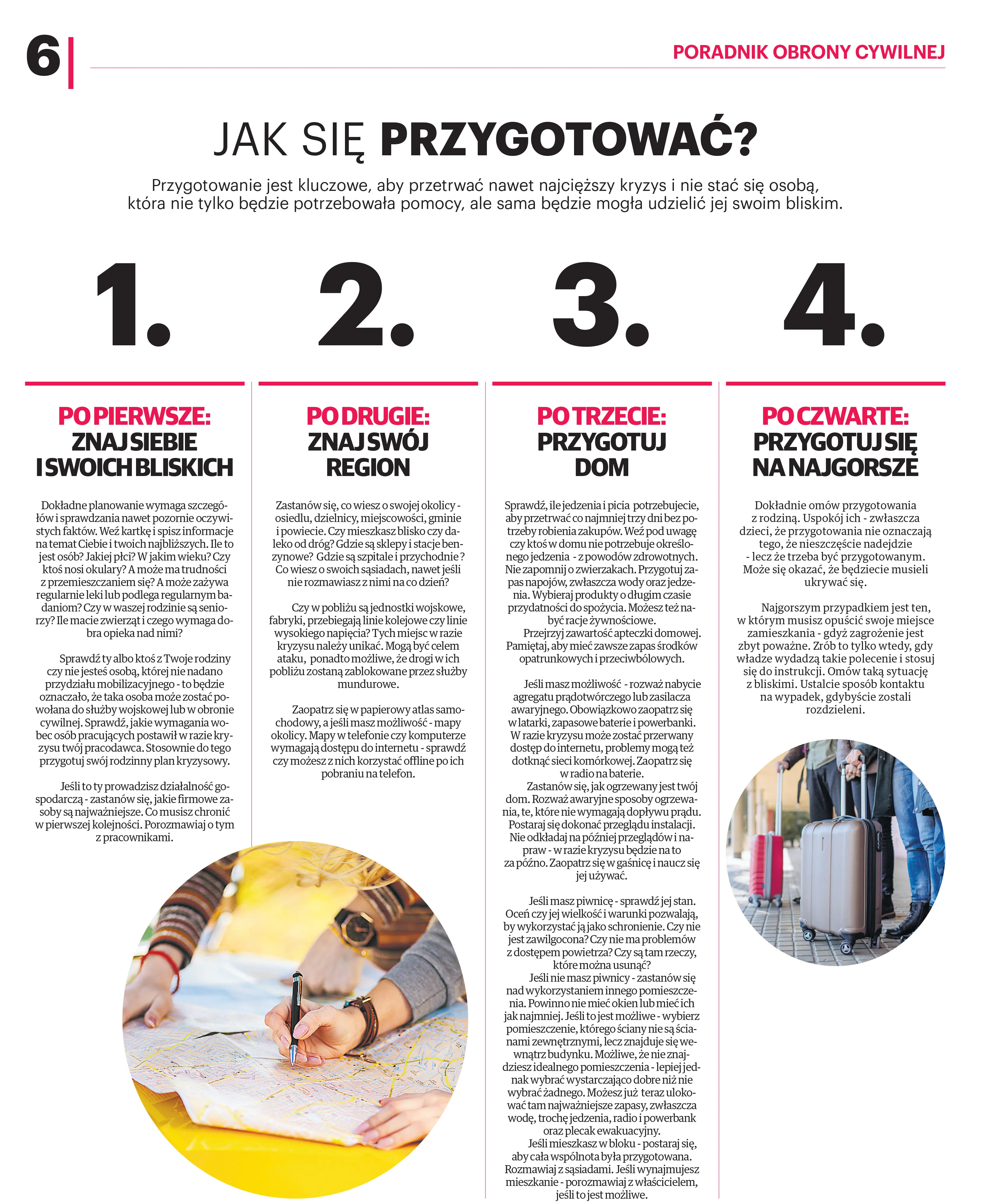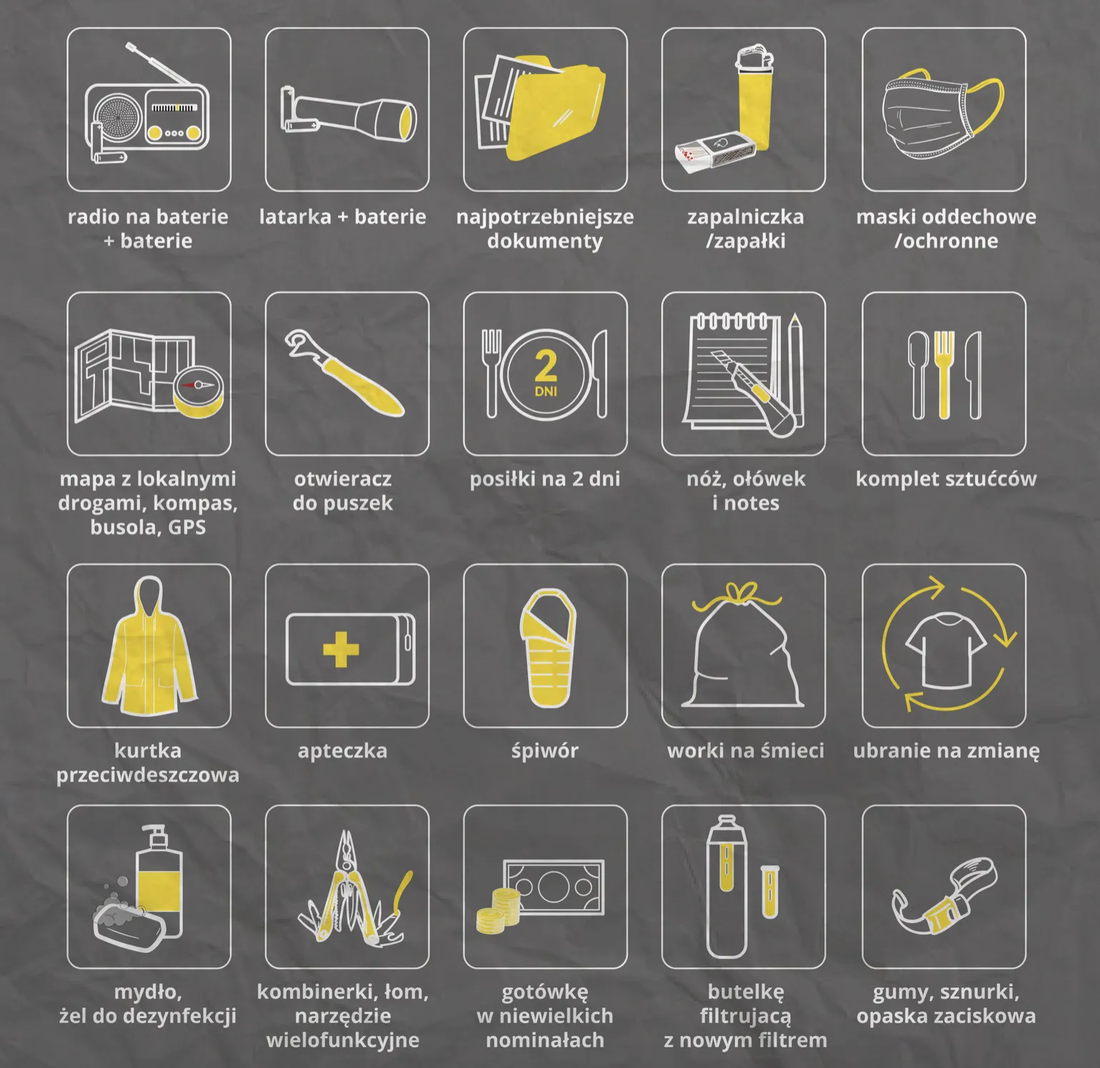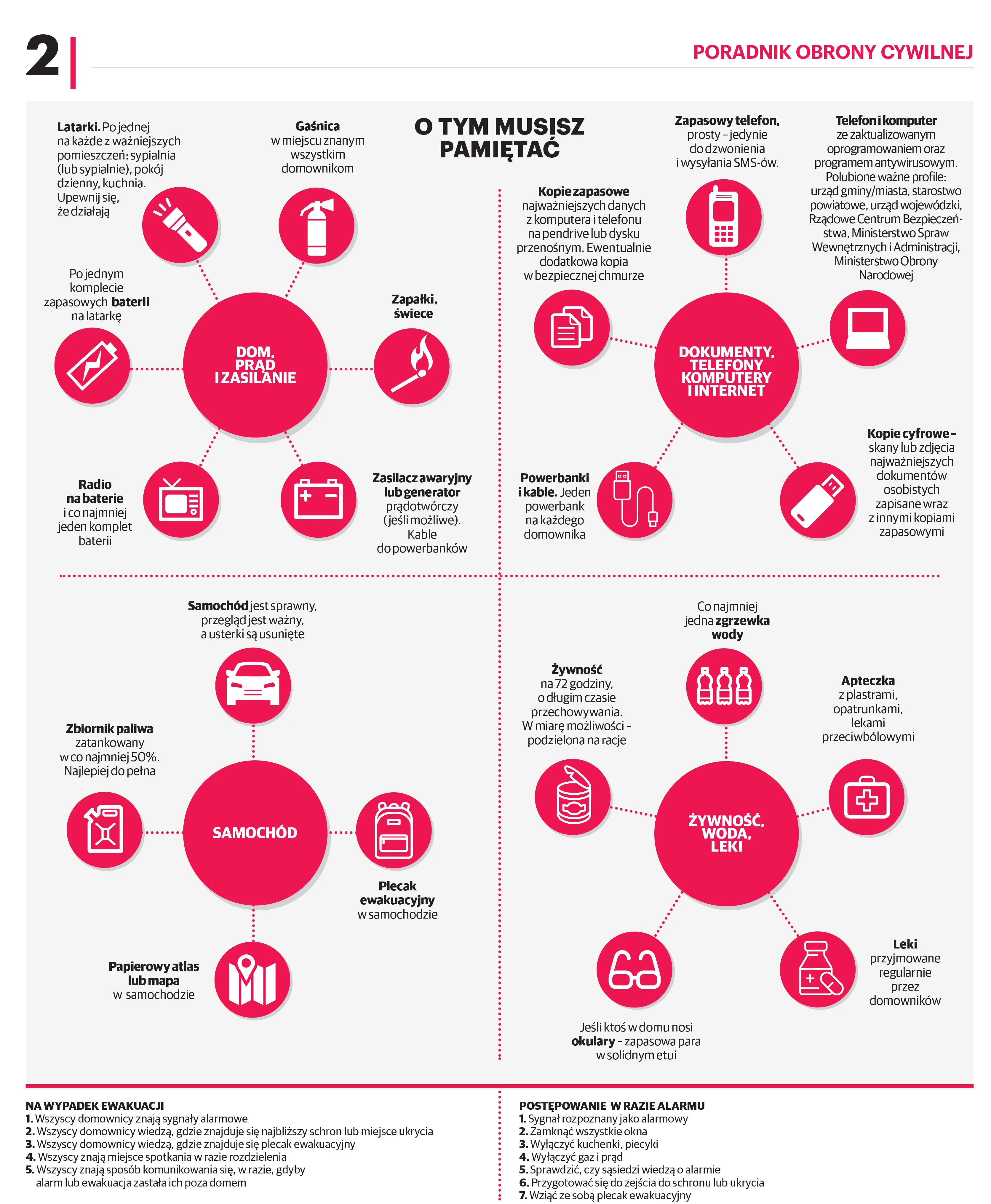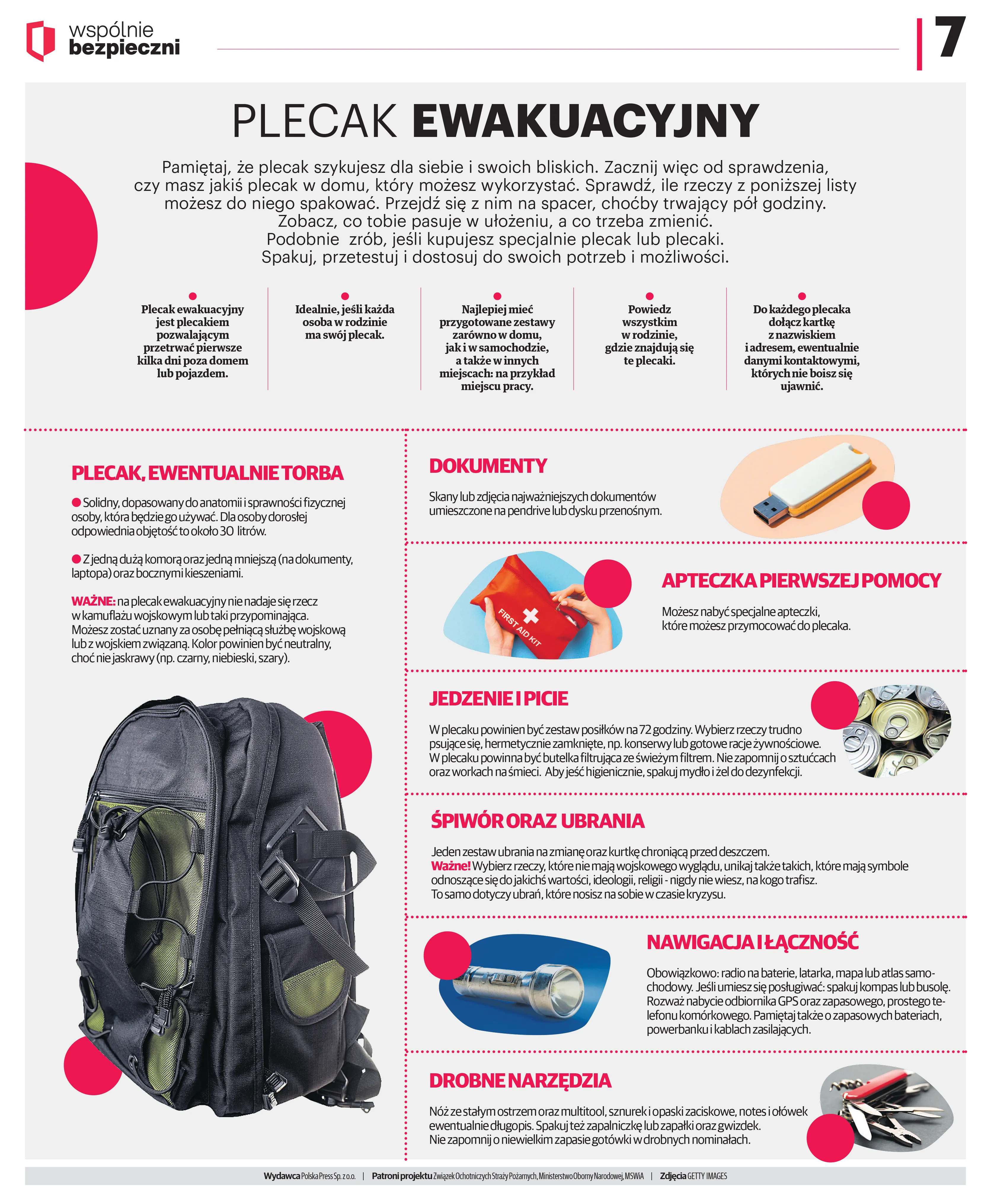 W sytuacjach kryzysowych liczy się opanowanie i posiadanie gotowego planu działania. Jednym z najważniejszych kroków jest przygotowanie „plecaka ewakuacyjnego”, który powinien być spakowany i gotowy do użycia w każdej chwili. Powinny się w nim znaleźć: