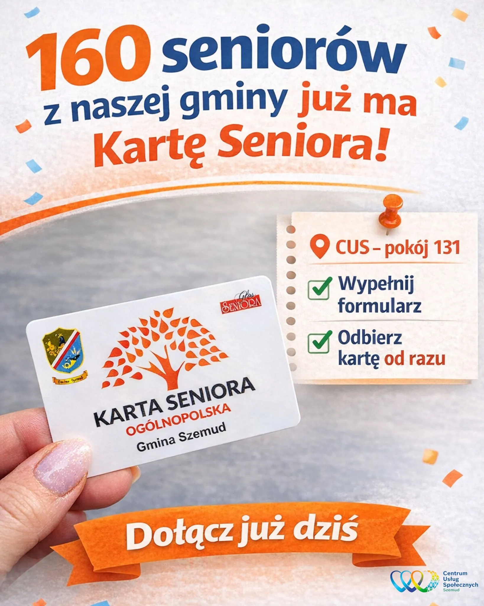 Grono posiadaczy Ogólnopolskiej Karty Seniora w Gminie Szemud rośnie w błyskawicznym tempie. Program został oficjalnie zainaugurowany w ubiegły piątek, 17 kwietnia, podczas uroczystego otwarcia nowej siedziby Centrum Usług Społecznych w Szemudzie. To właśnie wtedy pierwsi seniorzy odebrali swoje karty, dając sygnał pozostałym mieszkańcom, że warto korzystać z przygotowanych przywilejów. Do tej pory karta trafiła już do rąk 160 osób. Jeśli ukończyłeś 60 lat, a jeszcze nie masz swojej karty – możesz to zmienić w zaledwie kilka minut!