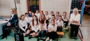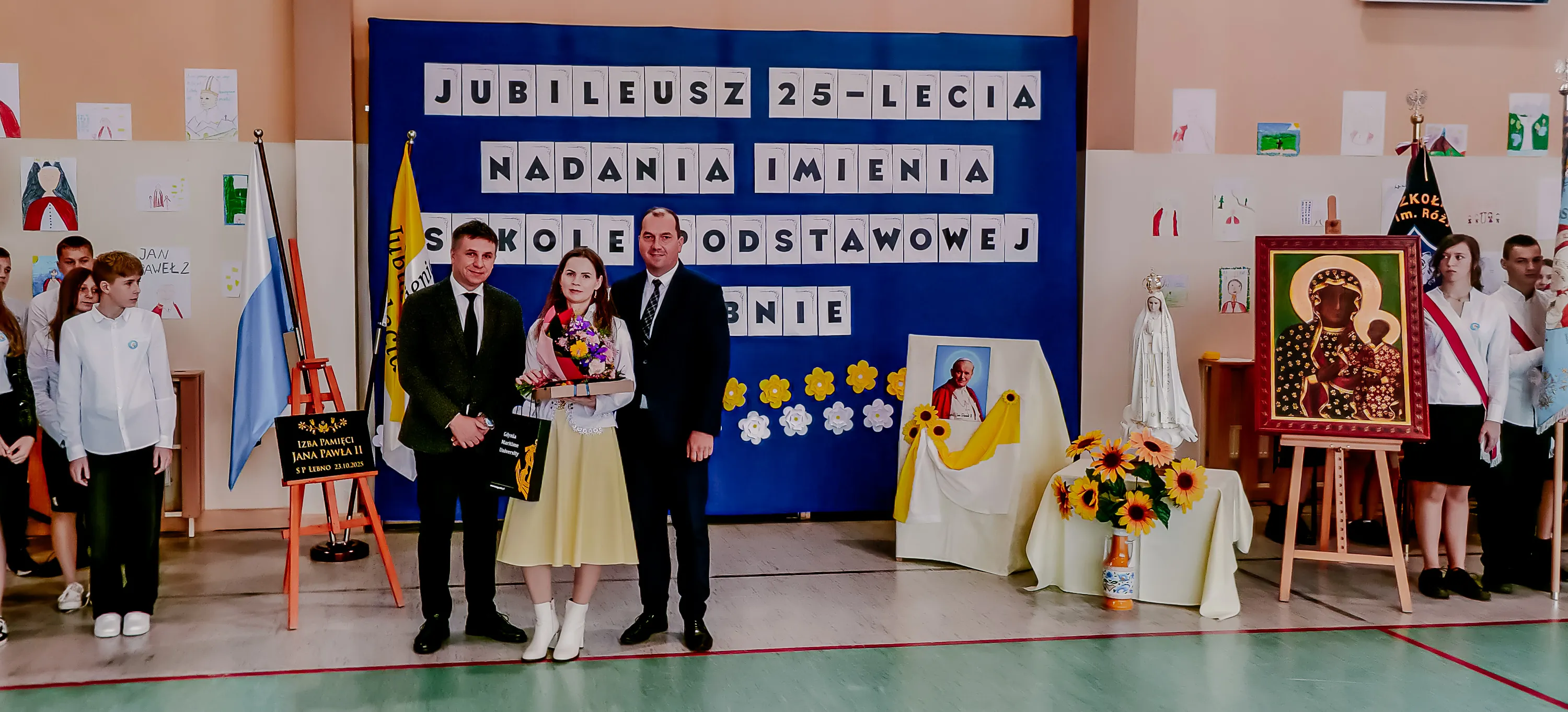 Po ceremonii na skwerze, uroczystości przeniosły się do Szkoły Podstawowej im. Jana Pawła II. Uczniowie przygotowali inspirujący program artystyczny poświęcony postaci Ojca Świętego oraz przypomnieli zgromadzonym historię wyboru patrona szkoły.