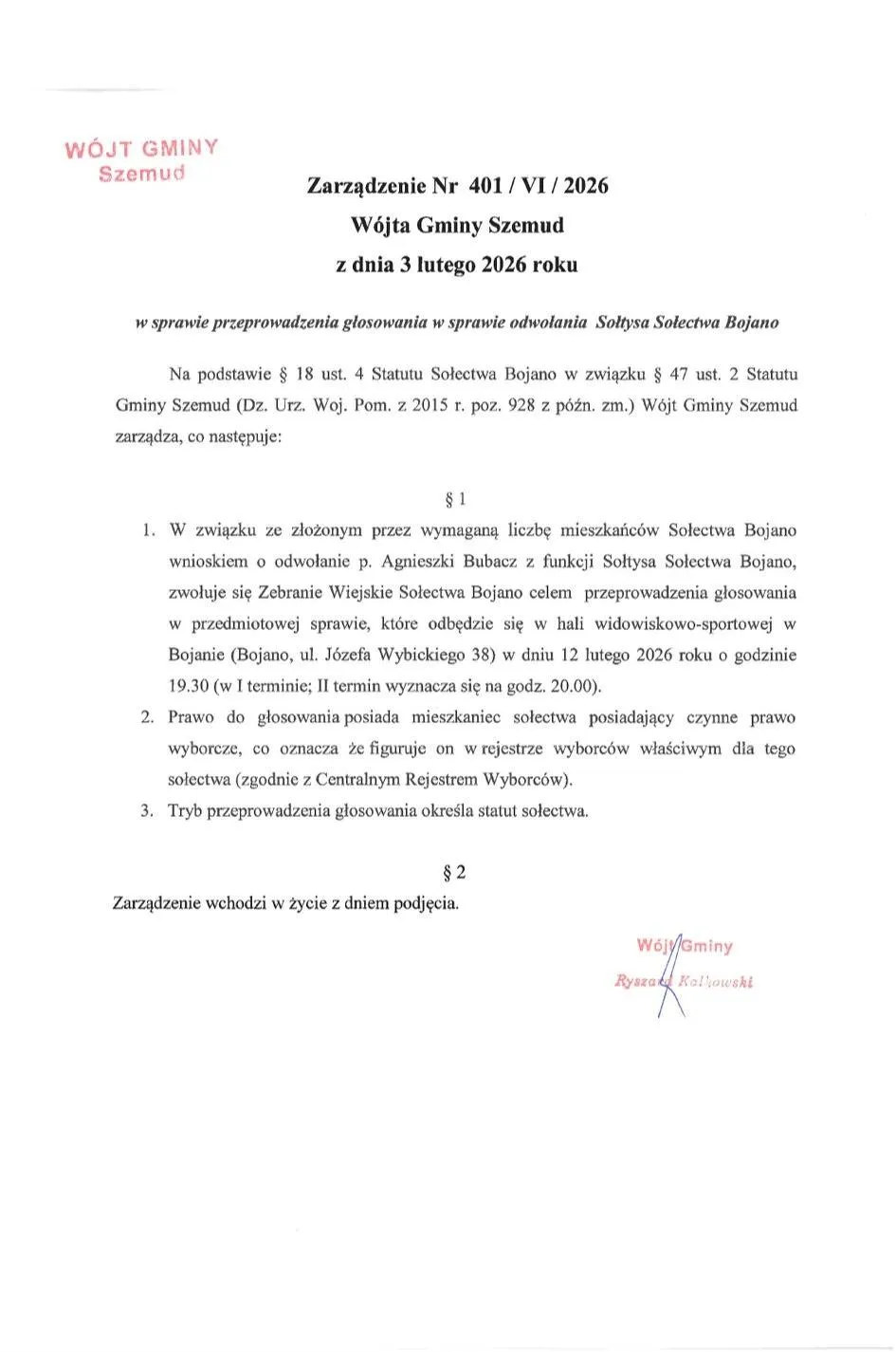 W odpowiedzi na złożony przez mieszkańców wniosek, Wójt Gminy Szemud podpisał 3 lutego 2026 roku Zarządzenie Nr 401/VI/2026, na mocy którego zwołano nadzwyczajne Zebranie Wiejskie poświęcone wyłącznie kwestii odwołania sołtys sołectwa Bojano. Wydarzenie to odbędzie się w czwartek, 12 lutego 2026 roku, w hali widowiskowo-sportowej przy ulicy Józefa Wybickiego 38 w Bojanie, przy czym pierwszy termin spotkania wyznaczono na godzinę 19:30, a drugi na 20:00.