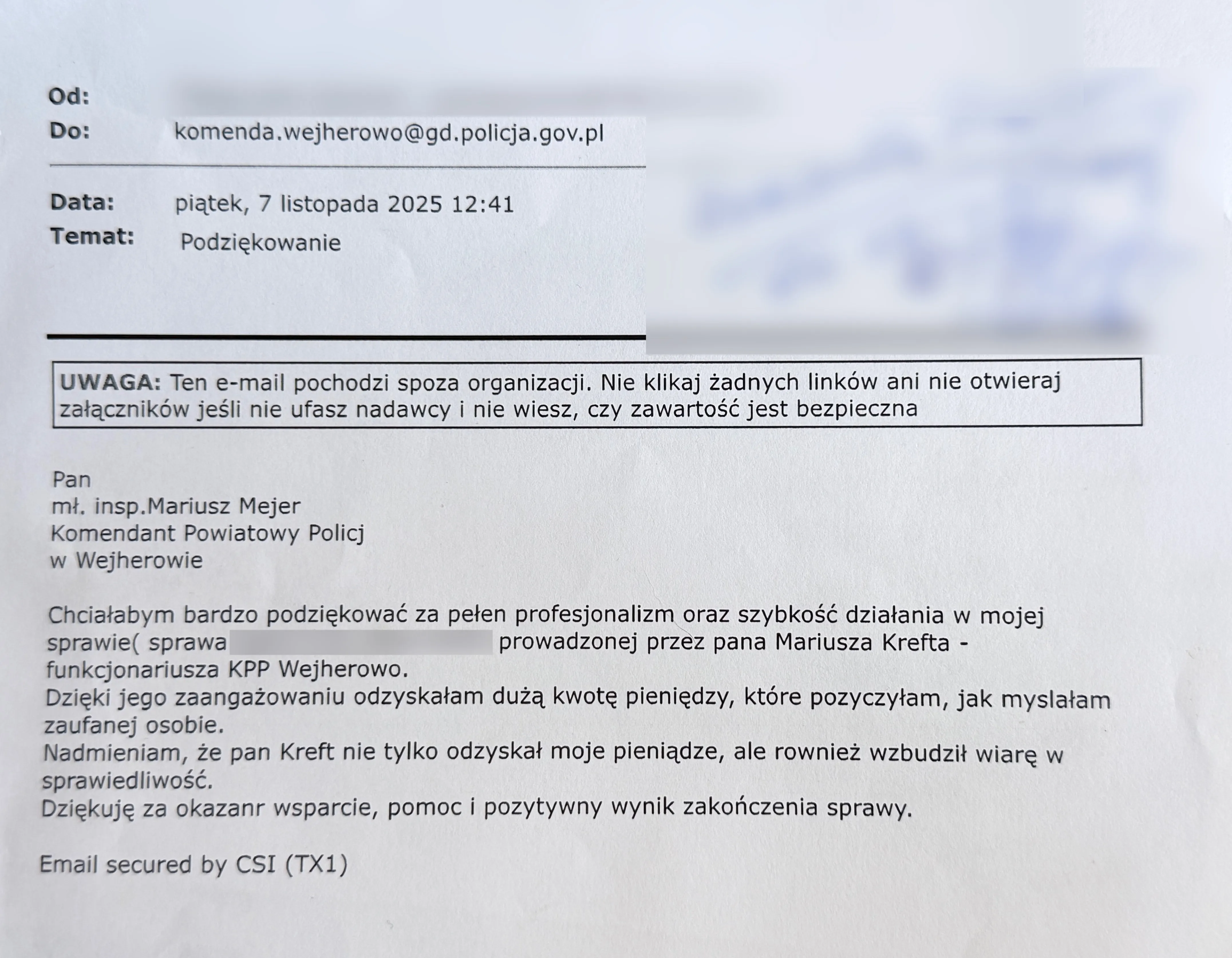 Do Komendy Powiatowej Policji w Wejherowie wpłynęły podziękowania, które są najlepszym dowodem na to, że determinacja i profesjonalizm funkcjonariuszy mają realny wpływ na poczucie sprawiedliwości mieszkańców. Dzięki zaangażowaniu asp. Mariusza Krefta, mieszkanka powiatu odzyskała znaczną sumę pieniędzy, którą straciła, pożyczając ją nieuczciwemu znajomemu.