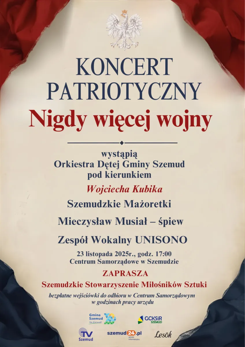 Już w najbliższą niedzielę, 23 listopada o godzinie 17:00 w Centrum Samorządowym w Szemudzie odbędzie się kolejny Koncert Patriotyczny pod hasłem „Nigdy więcej wojny”. Bezpłatne wejściówki są do odbioru w sekretariacie Urzędu Gminy Szemud w godzinach pracy urzędu.