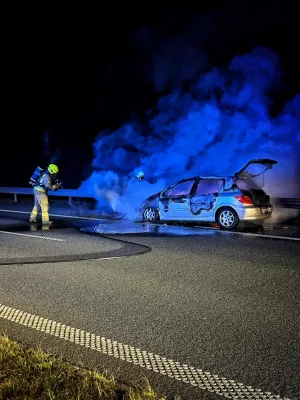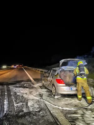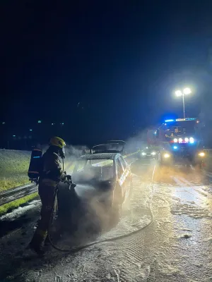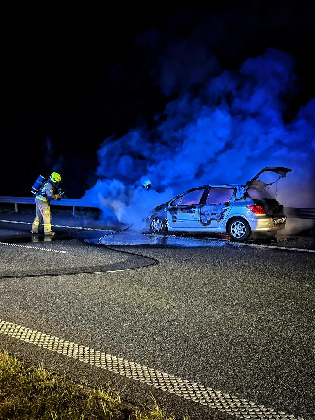Jak ustalono na miejscu zdarzenia, pożar wybuchł podczas jazdy. Kierowca i pasażerka zareagowali błyskawicznie – zdołali bezpiecznie opuścić pojazd, zanim ogień rozprzestrzenił się na całe auto. Dzięki ich szybkiej reakcji nikt nie odniósł obrażeń.