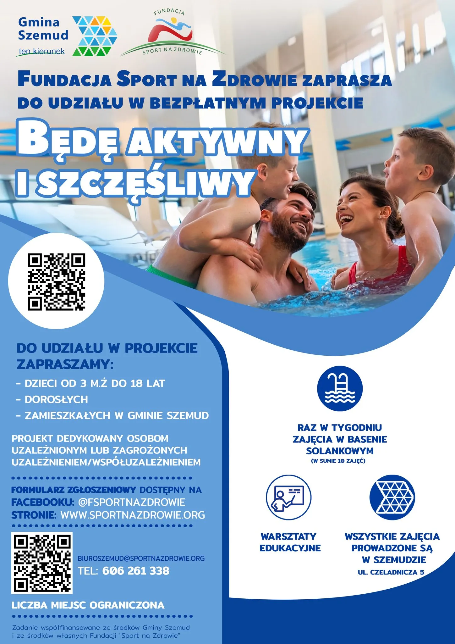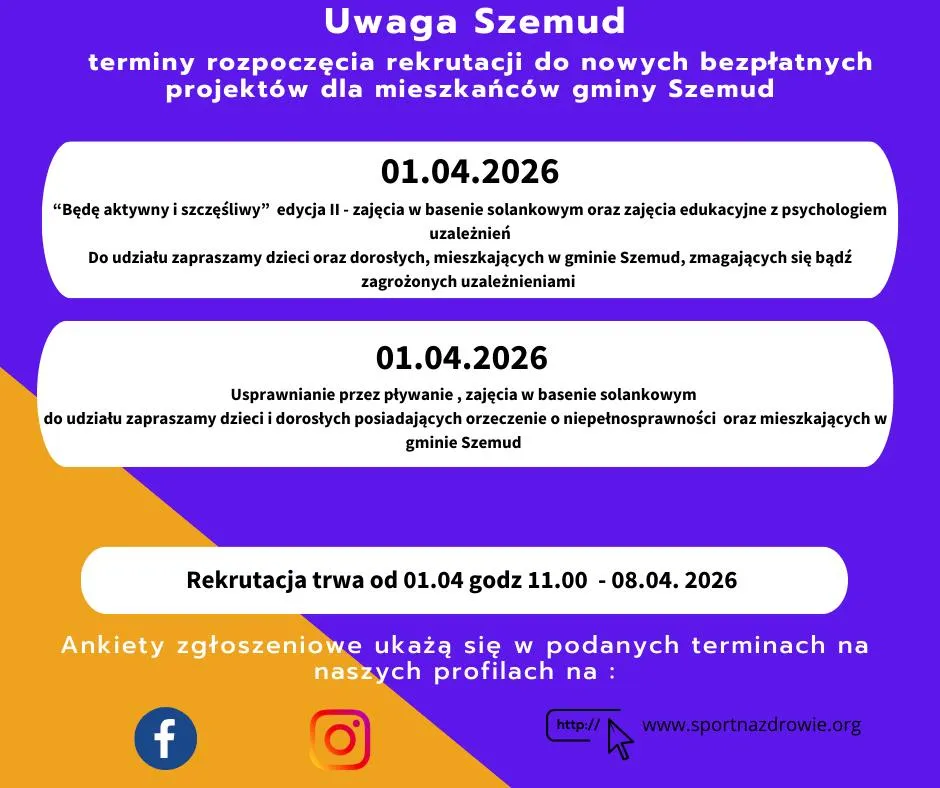 Dziś, 1 kwietnia 2026 roku, startuje nabór do dwóch projektów prozdrowotnych. Programy oferują wsparcie oraz zajęcia sportowe całkowicie za darmo, a ich realizacja odbędzie się w nowoczesnym obiekcie na terenie gminy Szemud. Oba projekty są organizowane i prowadzone przez Fundację Sport na Zdrowie.