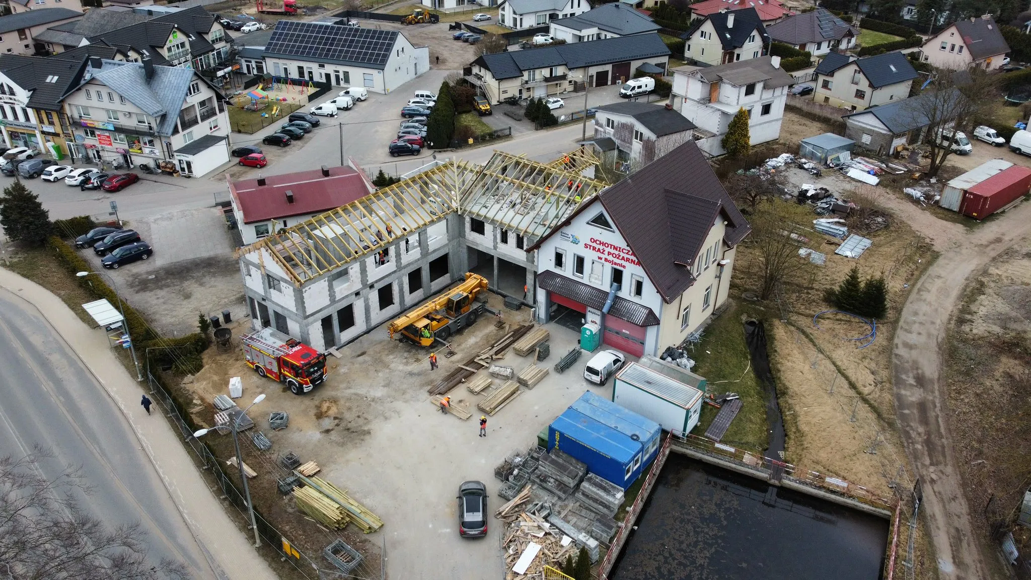 W piątek, 3 kwietnia, na placu budowy przy OSP Bojano odbyła się uroczystość zawieszenia wiechy. Tradycyjna korona zwieńczyła konstrukcję dachu, co w budownictwie oznacza zakończenie najważniejszego etapu prac konstrukcyjnych. Inwestycja, której koszt przekracza 8 milionów złotych, wchodzi teraz w kolejną fazę prac.