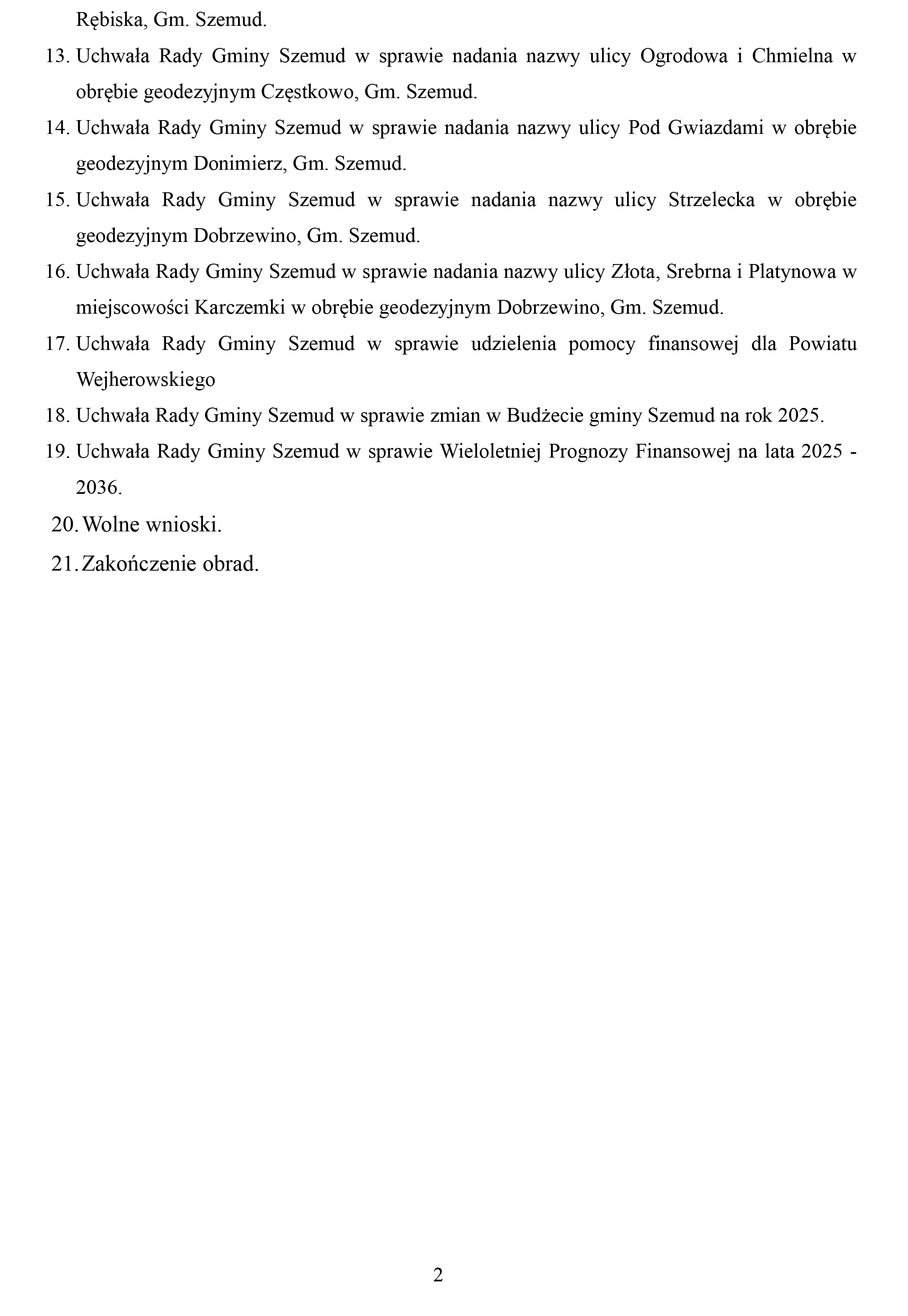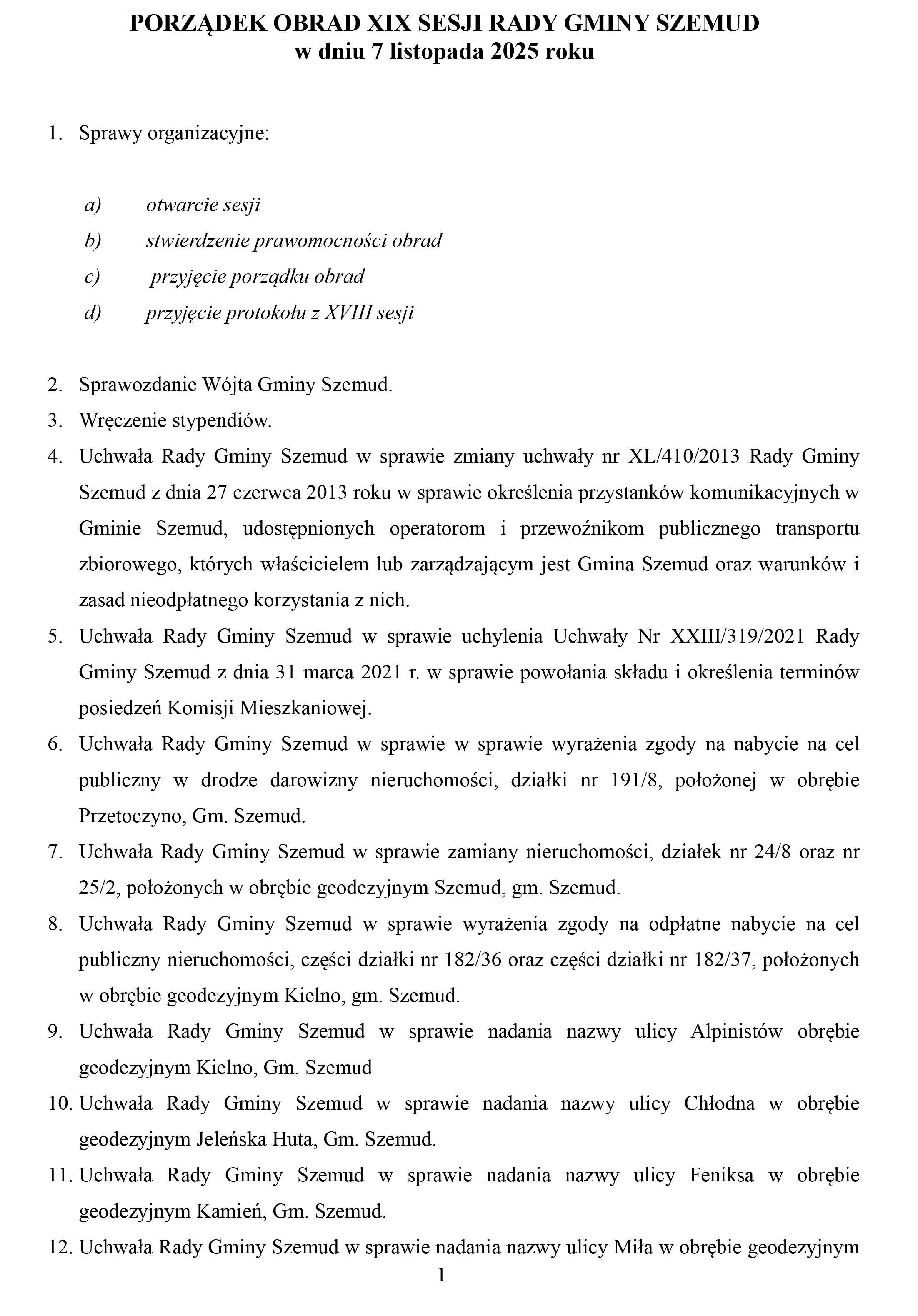 W piątek, 7 listopada 2025 roku, odbędzie się XIX Sesja Rady Gminy Szemud. Obrady rozpoczną się o godzinie 8:30 w Centrum Samorządowym w Szemudzie (ul. Samorządowa 1), a ich porządek obejmuje 21 punktów.