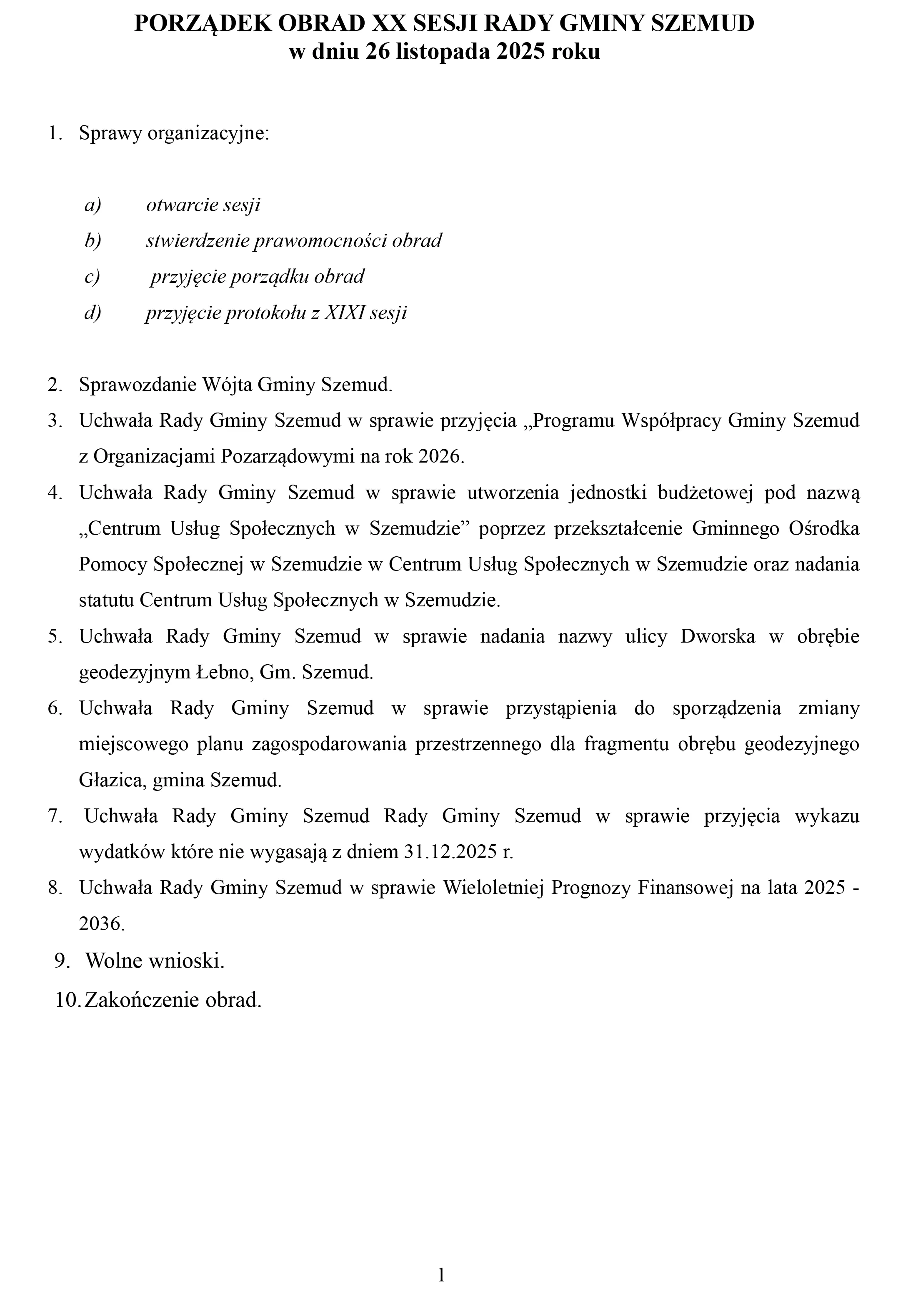 W środę, 26 listopada 2025 roku odbędzie się XX Sesja Rady Gminy Szemud. Obrady rozpoczną się o godzinie 8:00 w Centrum Samorządowym w Szemudzie (ul. Samorządowa 1), a ich porządek obejmuje 10 punktów.