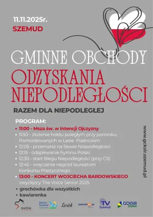 11 listopada 2025 roku Gmina Szemud zaprasza mieszkańców do wspólnego i aktywnego świętowania 107. rocznicy odzyskania Niepodległości. Program obchodów jest wyjątkowo bogaty – od tradycyjnej Mszy, przez sportowe zmagania i zajęcia rodzinne, aż po koncerty. Wydarzenia odbywają się pod hasłem „Razem dla Niepodległej” i obejmują szereg inicjatyw w Centrum Samorządowym, na boisku w Koleczkowie oraz na ulicach Szemudu.