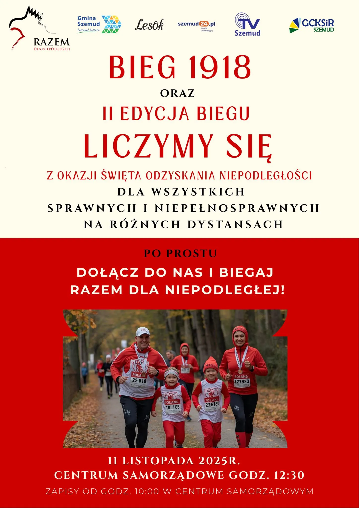 Ważnym elementem gminnych obchodów jest sportowa rywalizacja, w której może wziąć udział każdy. O godzinie 12:30 rozpocznie się Bieg 1918 oraz II edycja Biegu LICZYMY SIĘ. Biegi te są skierowane dla wszystkich: sprawnych i niepełnosprawnych, na różnych dystansach. To zaproszenie do wspólnego biegania pod hasłem: „Dołącz do nas i biegaj razem dla Niepodległej!”. Na scenie Centrum Samorządowego o godzinie 13:00 odbędzie się Koncert Dla Niepodległej, wystąpi Wojciech Bardowski, zwycięzca programu „The Voice Senior 2025”.