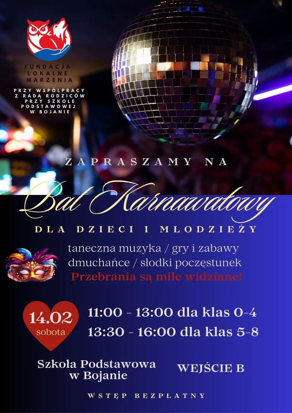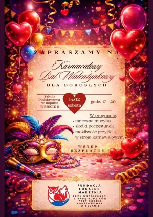 Tegoroczne Walentynki w Bojanie zapowiadają się wyjątkowo hucznie. Już w sobotę, 14 lutego 2026 roku, Fundacja Lokalne Marzenia, we współpracy z Dyrekcją oraz Radą Rodziców Szkoły Podstawowej w Bojanie, zaprasza wszystkich mieszkańców – od najmłodszych po dorosłych – na niezapomniany Bal Karnawałowy.