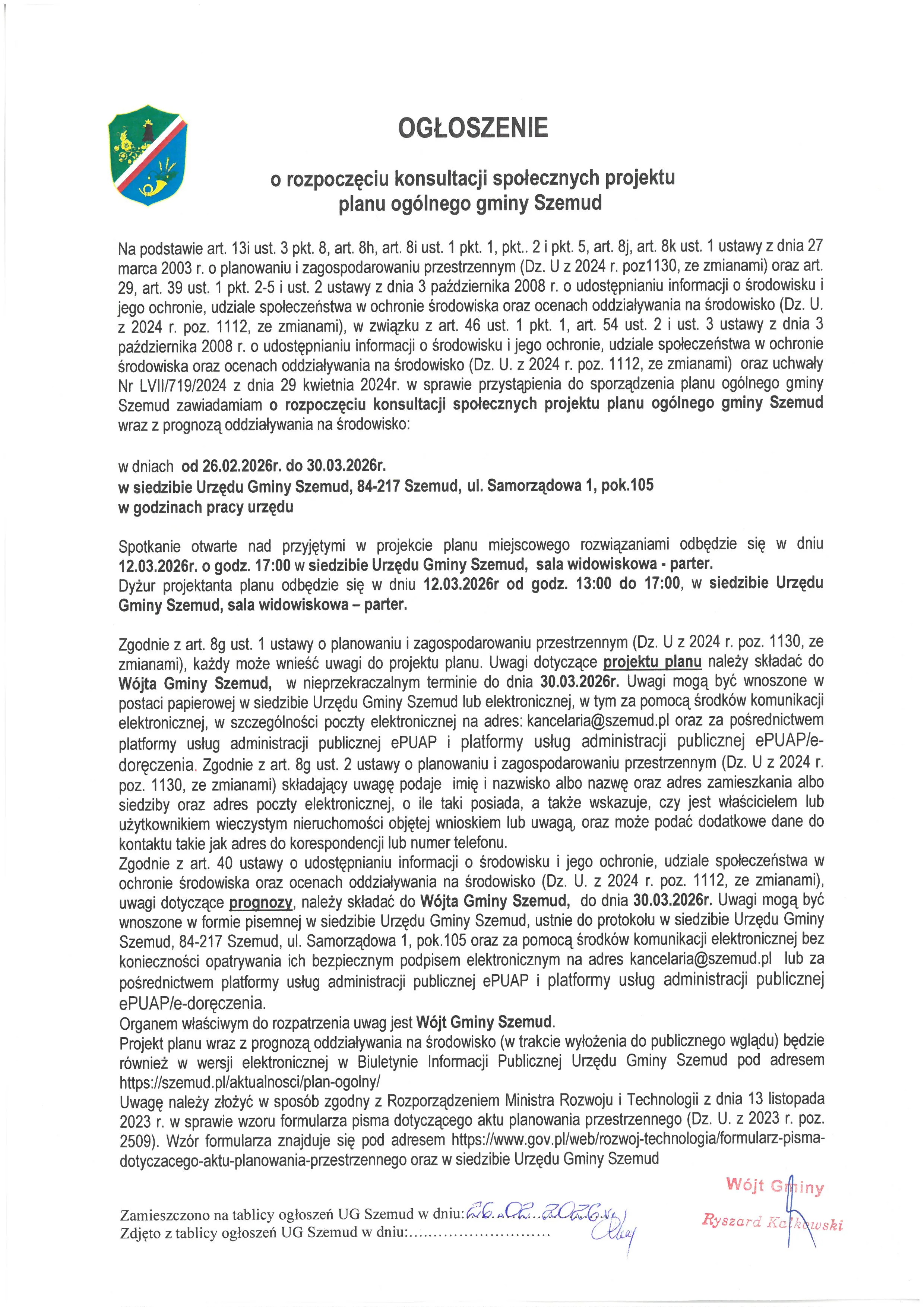 Projekt Planu Ogólnego jest wyłożony do publicznego wglądu od 26 lutego do 30 marca 2026 r.. W tym terminie każdy mieszkaniec może złożyć swoje uwagi do Wójta Gminy Szemud. Można to zrobić: