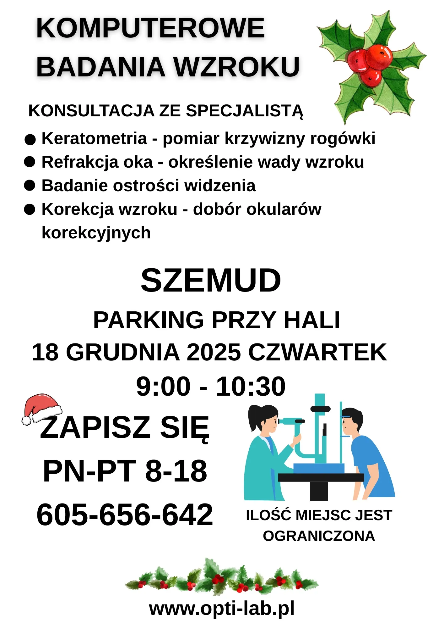 Już w czwartek, 18 grudnia 2025 roku, mieszkańcy Szemuda i okolic będą mieli okazję skorzystać z profesjonalnych, komputerowych badań wzroku oferowanych przez Opti-Lab Pracownia Optyczna.
