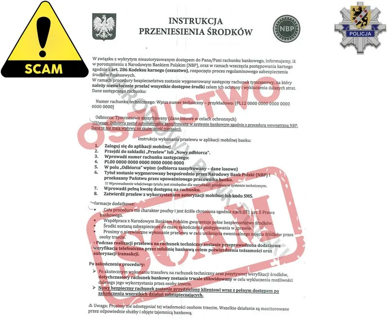 Z ustaleń policjantów wynika, że do pokrzywdzonej zadzwonił mężczyzna podający się za pracownika banku. Stosując techniki manipulacji, przekonał kobietę, że jej pieniądze są zagrożone i wymagają „natychmiastowego zabezpieczenia”. Aby uwiarygodnić swoją historię, przestępcy posunęli się do kolejnego oszustwa – wysłali ofierze fikcyjną wiadomość e-mail. W wiadomości załączyli sfałszowane pisma oraz instrukcję, gdzie należy przelać środki. Działając pod ogromną presją czasu i w stresie, 41-latka udała się do wpłatomatu, gdzie dokonała wpłaty 15 000 zł. Pieniądze natychmiast trafiły na konto oszustów.