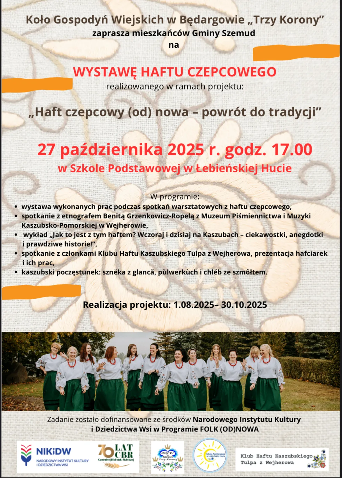 Koło Gospodyń Wiejskich w Będargowie "Trzy Korony" zaprasza na wydarzenie kończące projekt „Haft czepcowy (od)nowa”. W poniedziałek, 27 października o godzinie 17:00, w Szkole Podstawowej w Łebieńskiej Hucie, odbędzie się wystawa wykonanych prac. Program spotkania obejmuje również spotkanie z etnografem i doświadczonymi hafciarkami z Wejherowa. Jak podkreślają organizatorki: „Nasze kulturowe dziedzictwo jest na wyciągnięcie ręki. Przyjdź, zobacz i posłuchaj.”