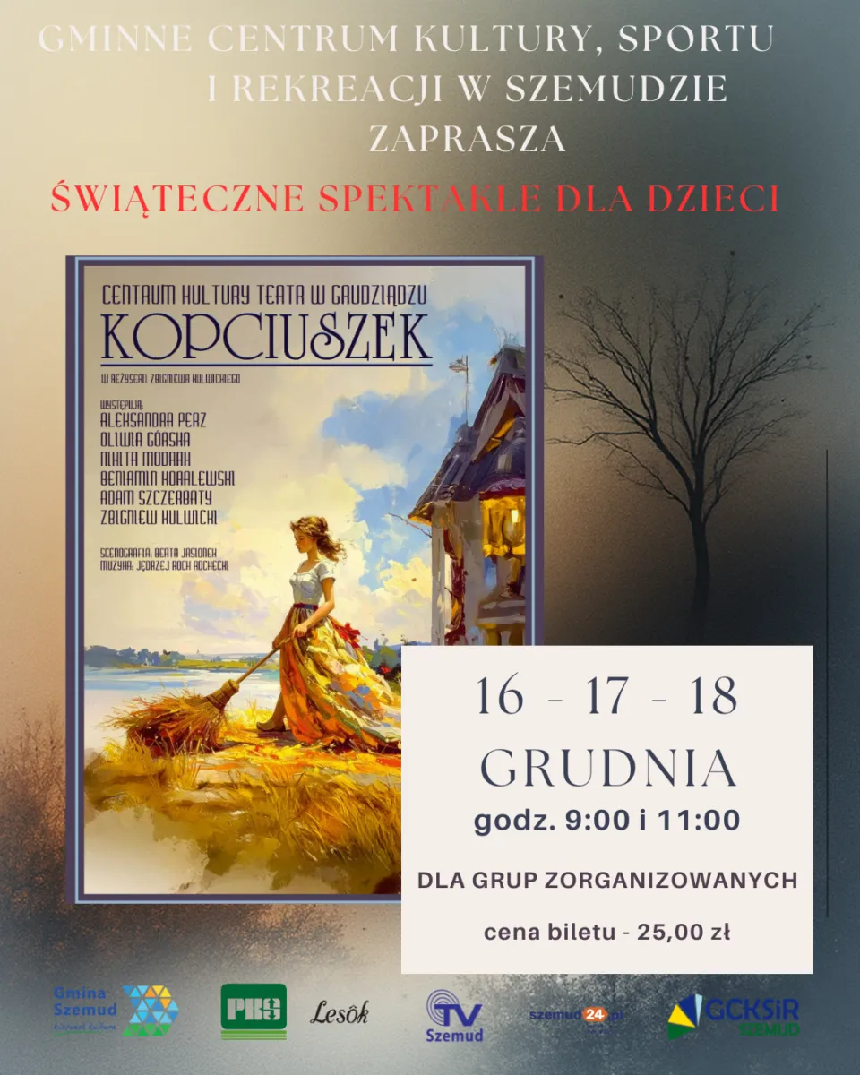 - Gminne Centrum Kultury, Sportu i Rekreacji w Szemudzie zaprasza 16, 17 i 18 grudnia na przedpołudniowe świąteczne spektakle dla grup zorganizowanych.