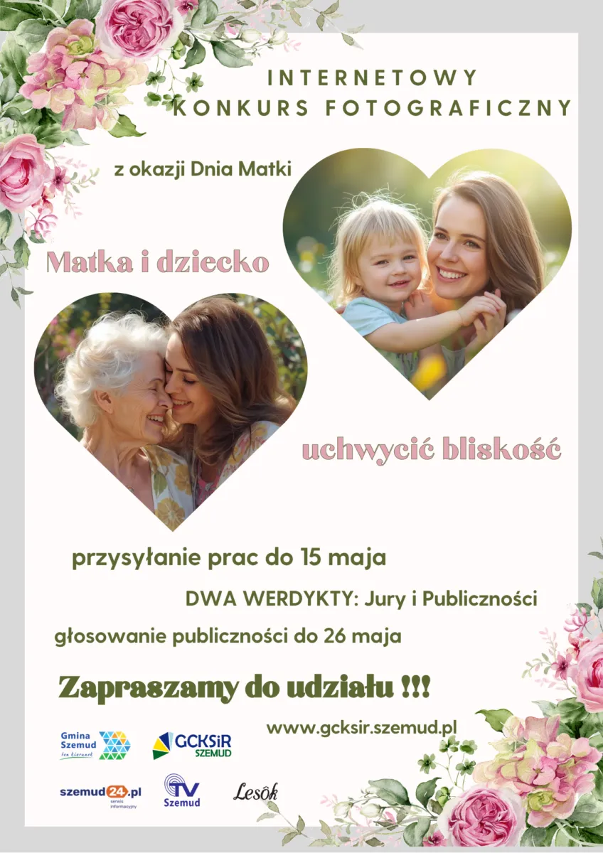 Gminne Centrum Kultury, Sportu i Rekreacji w Szemudzie zaprasza wszystkich pasjonatów fotografii do udziału w konkursie „Matka i dziecko – uchwycić bliskość”, w którym nagrodzone zostaną najpiękniejsze kadry pełne emocji i autentyczności. Konkurs ma charakter otwarty i skierowany jest do fotografów amatorów – osób, które uwieczniają ważne chwile z potrzeby serca. Organizatorzy czekają na zdjęcia ukazujące relację mamy i dziecka bez względu na wiek – mile widziane są zarówno fotografie niemowląt, jak i dorosłych dzieci z ich mamami.