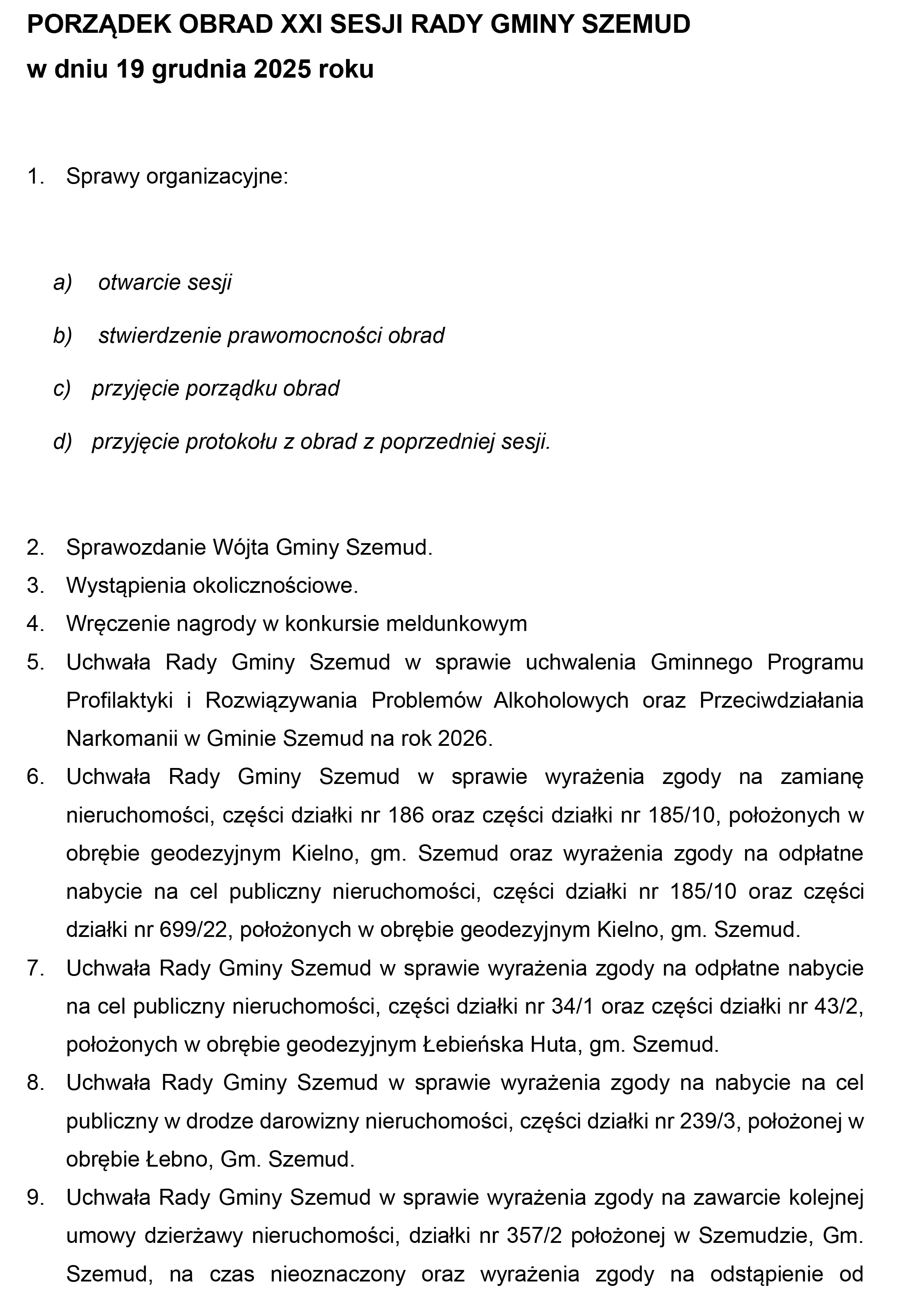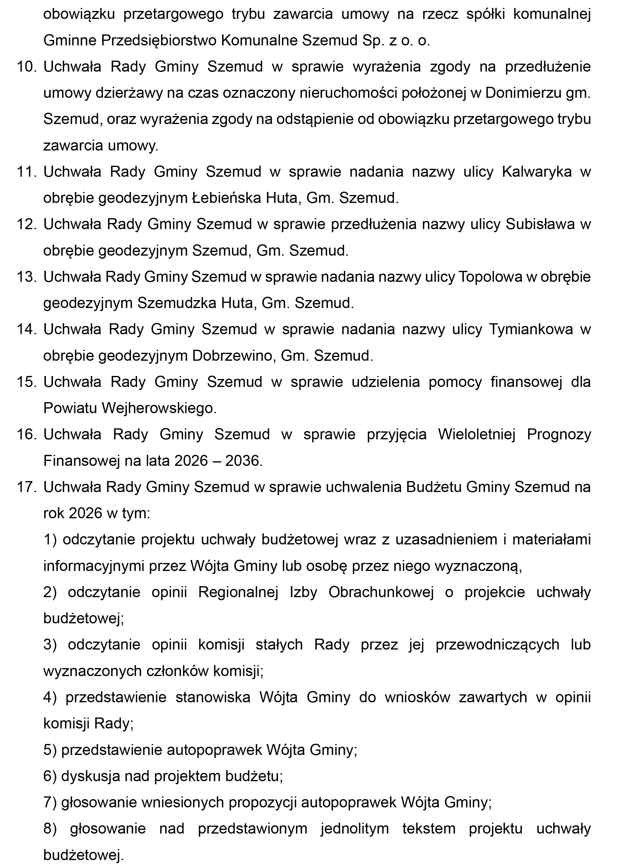19 grudnia 2025 roku o godzinie 8:30 w Centrum Samorządowym w Szemudzie, ul. Samorządowa 1 odbędzie się uroczysta świąteczno - noworoczna XXI Sesja Rady Gminy Szemud. Będzie to też sesja budżetowa, na której zostanie przedstawiony projekt uchwały w sprawie przyjęcia budżetu gminy na rok 2026 oraz projekt uchwały w sprawie przyjęcia Wieloletniej Prognozy Finansowej na lata 2026 - 2036. Porządek obrad sesji zawiera 21 punktów. Obrady będą transmitowane online - pod tym linkiem.