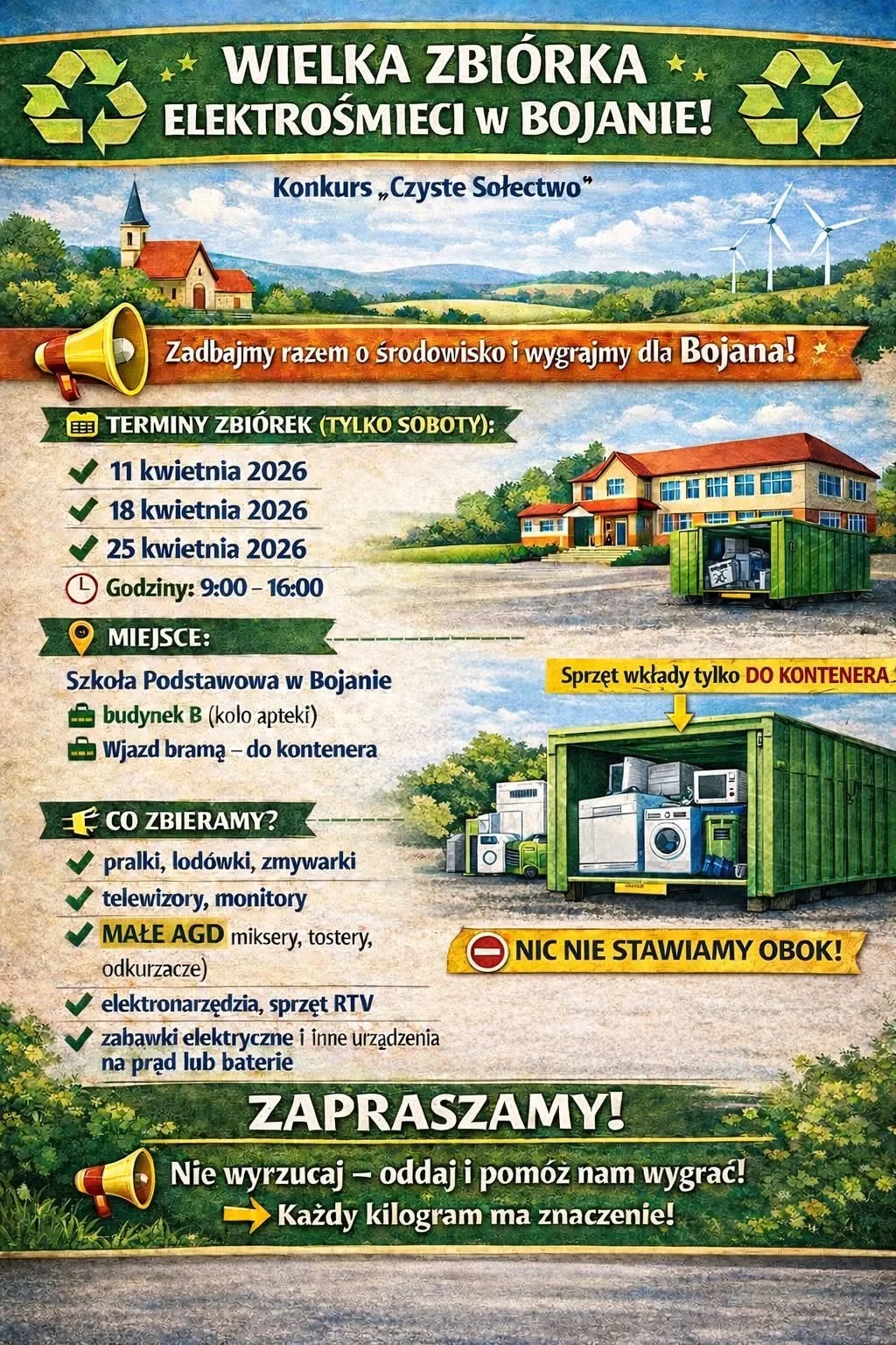 Akcja „Czyste Sołectwo” to korzyść podwójna. Po pierwsze, dbamy o planetę, oddając odpady do profesjonalnego recyklingu. Po drugie, realnie wspieramy Bojano. Za każdą tonę zebranych elektroodpadów sołectwo otrzyma 400 zł. Cały dochód ze zbiórki zostanie przeznaczony na lokalne potrzeby mieszkańców.