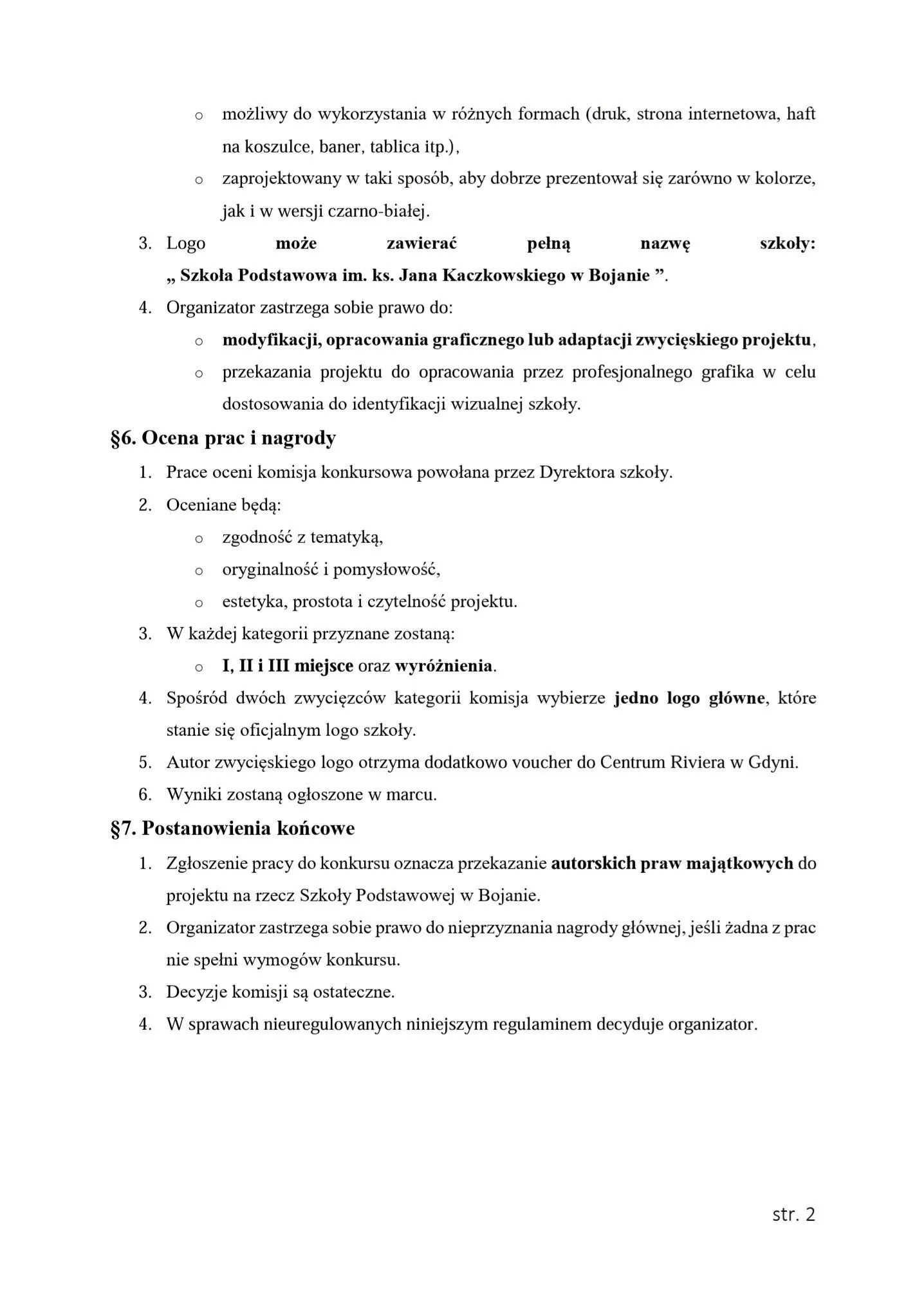 Z nadesłanych prac komisja wybierze jedno główne logo, które po ewentualnej adaptacji graficznej stanie się oficjalnym znakiem Szkoły Podstawowej im. ks. Jana Kaczkowskiego w Bojanie. Na zwycięzców czekają nie tylko zaszczyty – autor głównego logo otrzyma dodatkowo voucher do Centrum Riviera w Gdyni.