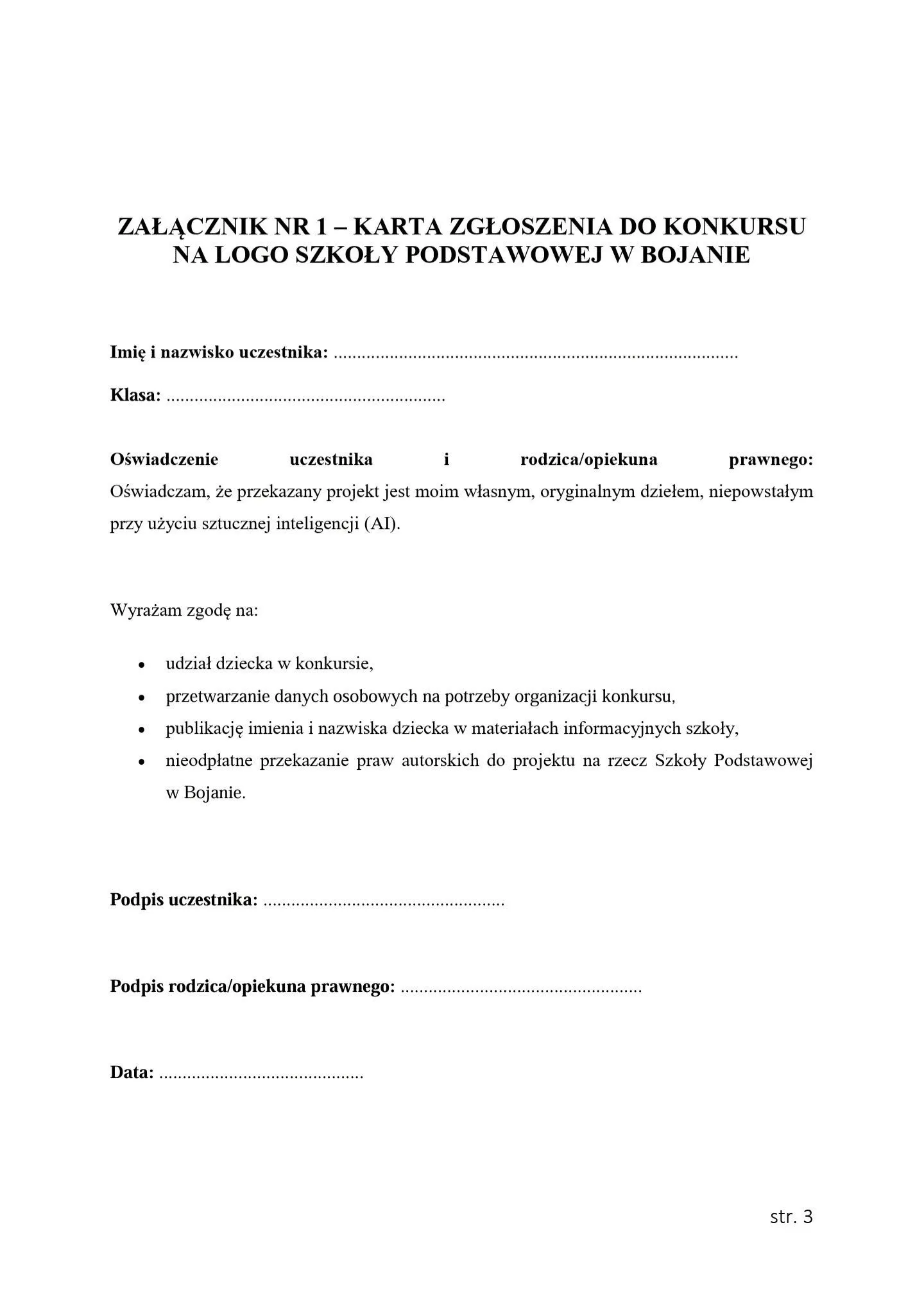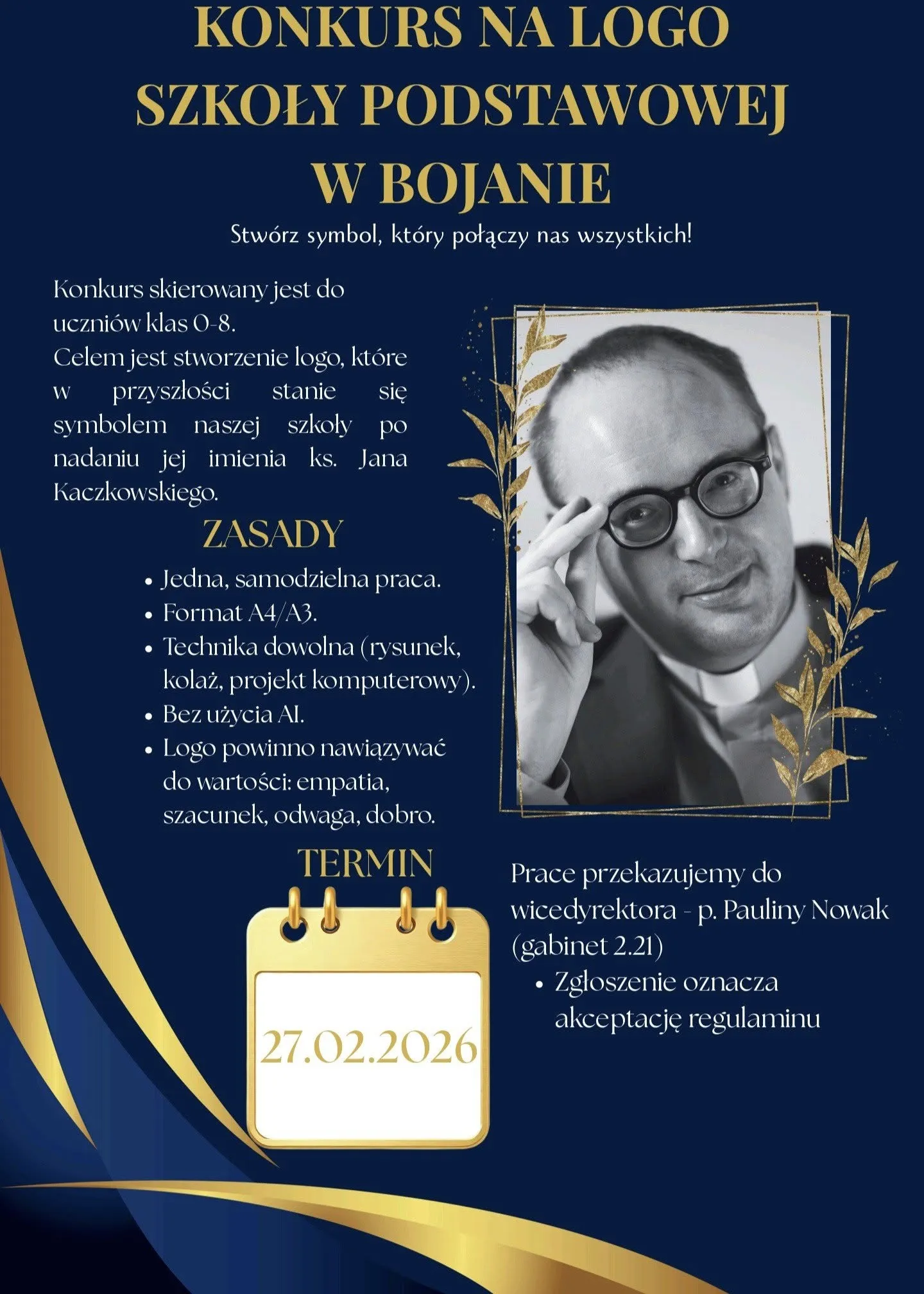 W związku z nadaniem imienia Szkole Podstawowej w Bojanie ks. Jana Kaczkowskiego, ogłoszono konkurs na projekt logo. To szansa dla uczniów, by ich kreatywność stała się oficjalną wizytówką szkoły na lata! Konkurs pod hasłem „Stwórz symbol, który połączy nas wszystkich!” skierowany jest do wszystkich uczniów klas 0–8.